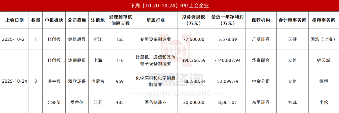 下周IPO及再融资上会概况 - 下周(10月20日-10月24日)将有4家IPO企业上会,合计拟募资68.44亿元 [1] - 下周将有2家再融资企业上会,合计拟募资13亿元 [5] 健信超导 (科创板) - 公司主要从事医用磁共振成像(MRI)设备核心部件(超导磁体、永磁体、梯度线圈)的研发、生产和销售,其产品占MRI设备核心部件成本约50% [7] - 公司是国内最早规模化生产高场强超导磁体的厂商之一,2015年以来在零挥发超导磁体领域打破了欧美、日本厂商的垄断 [7] - 在审期间公司调减了拟募资规模,从上会稿的8.65亿元缩减至7.75亿元,删除了补充流动资金项目 [2][3][5] - 募投项目包括年产600套无液氦超导磁体项目(拟投入2.75亿元)、年产600套高场强医用超导磁体技改项目(拟投入2.6亿元)和新型超导磁体研发项目(拟投入2.4亿元) [3][5][9] - 公司2024年度净利润为5,578.39万元,2025年1-6月净利润为3,191.84万元 [2][9] - 公司控股股东为许建益,直接持股41.51%,实际控制人许建益、许卉及许电波合计控制公司59.92%表决权 [7][8] 沐曦股份 (科创板) - 公司致力于自主研发全栈高性能GPU芯片及计算平台,产品应用于人工智能训练和推理、通用计算与图形渲染领域 [10] - 公司是国内少数系统掌握高性能GPU芯片及其基础系统软件研发、设计和量产技术的企业之一 [10] - 公司目前处于亏损状态,2024年度净利润为-140,887.94万元,2025年1-3月净利润为-23,251.22万元 [2][12] - 公司2024年度营业收入为74,307.16万元,2025年1-3月营业收入为32,041.53万元 [12] - 公司控股股东为上海骄迈,持股13.30%,实际控制人陈维良合计控制公司22.94%股权 [11] 双欣环保 (深主板) - 公司是一家专业从事聚乙烯醇(PVA)全产业链产品研发、生产、销售的高新技术企业 [15] - 公司拥有聚乙烯醇全产业链布局,产品包括PVA、聚乙烯醇特种纤维、醋酸乙烯(VAC)、碳化钙(电石)等 [15] - 公司2024年度净利润为52,099.79万元,2025年1-6月净利润为28,107.52万元 [2][17] - 公司拟募资186,538.34万元,用于PVB树脂及功能性膜项目、水基型胶粘剂项目、技术改造及补充流动资金等7个项目 [2][18] - 公司控股股东为内蒙古双欣能源化工有限公司,持股57.11%,实际控制人为乔玉华 [15] 爱舍伦 (北交所) - 公司主要从事应用在康复护理与医疗防护领域的一次性医用耗材的研发、生产和销售,通过ODM/OEM方式为国际知名医疗器械品牌厂商提供产品 [19] - 公司产品涵盖康复护理产品、手术感控产品两个核心品类,包括医用护理垫、医用冰袋、手术衣等 [19] - 公司2024年度净利润为8,061.07万元(招股书表格单位为万元,数据部分单位为元,数值8,061.07与80,610,738.39元吻合) [2][21] - 公司拟募资30,000.00万元,用于凯普乐公共卫生医疗物资产业园建设项目 [2][22] - 公司控股股东为江苏诺维克科技投资有限公司,持股79.58%,实际控制人为张勇 [20] 澳弘电子 (再融资 - 沪主板) - 公司是一家专业从事印制电路板(PCB)研发、生产和销售的高新技术企业,产品包括单面板、双面板和多层板 [23][24] - 公司产品应用于智能家居、消费办公、电源能源、新能源汽车、AI算力中心、卫星互联网等领域 [24] - 公司拟通过公开发行可转债募资58,000.00万元,用于泰国生产基地建设项目 [6][27] - 公司2024年度归属于母公司所有者的净利润为14,149.86万元 [6][26] 联瑞新材 (再融资 - 科创板) - 公司专注于功能性先进粉体材料的研发、制造和销售,产品以硅基氧化物、铝基氧化物为基础,主要应用于半导体封装材料、电子电路基板等行业 [27] - 公司拟通过公开发行可转债募资72,000.00万元,用于高性能高速基板用超纯球形粉体材料项目(拟投入2.7亿元)、高导热高纯球形粉体材料项目(拟投入2.5亿元)和补充流动资金(拟投入2亿元) [6][30] - 公司2024年度归属于母公司所有者的净利润为25,137.44万元 [6]
