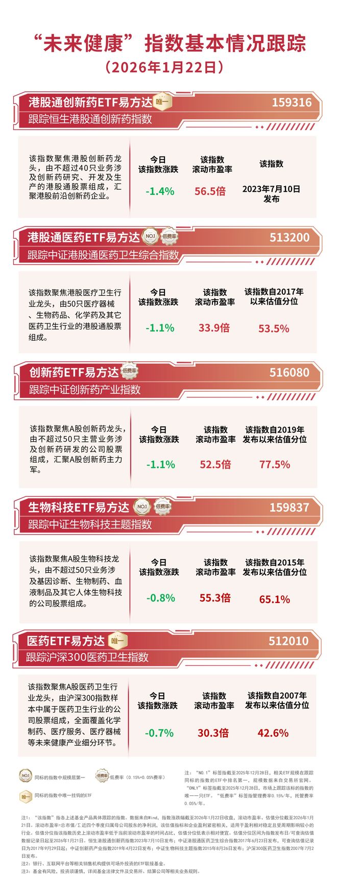 医药板块市场表现 - 2026年1月22日收盘,医药板块集体回调,恒生港股通创新药指数下跌1.4%,中证港股通医药卫生综合指数与中证创新药产业指数均下跌1.1%,中证生物科技主题指数下跌0.8%,沪深300医药卫生指数下跌0.7% [1] - 尽管市场下跌,资金呈现逆势布局,港股通创新药ETF易方达(159316)全天净申购超2000万份 [1] 行业观点与前景 - 中泰证券认为,在多重因素推动下,医药板块中CRO、CDMO需求端呈逐步恢复态势,叠加过去三年供给端持续出清,板块有望迎来盈利与估值同时提升的“戴维斯双击” [1] 相关指数与ETF产品概况 - 生物科技ETF易方达(159837)跟踪中证生物科技主题指数,该指数聚焦A股生物科技龙头,由不超过50只业务涉及基因诊断、生物制药、血液制品及其它人体生物科技的公司股票组成 [4] - 截至2026年1月22日,中证生物科技主题指数下跌0.8%,滚动市盈率为55.3倍,自2015年发布以来估值分位为65.1% [4] - 医药ETF易方达(512010)跟踪沪深300医药卫生指数,该指数聚焦A股医药卫生行业龙头,由沪深300指数样本中属于医药卫生行业的公司股票组成,全面覆盖化学制药、医疗服务、医疗器械等细分环节 [4] - 截至2026年1月22日,沪深300医药卫生指数下跌0.7%,滚动市盈率为30.3倍,自2007年发布以来估值分位为42.6% [4] - 截至2025年12月28日,医药ETF易方达(512010)是跟踪沪深300医药卫生指数的唯一一只ETF产品,且其管理费率为0.15%/年,托管费率为0.05%/年 [4][5]