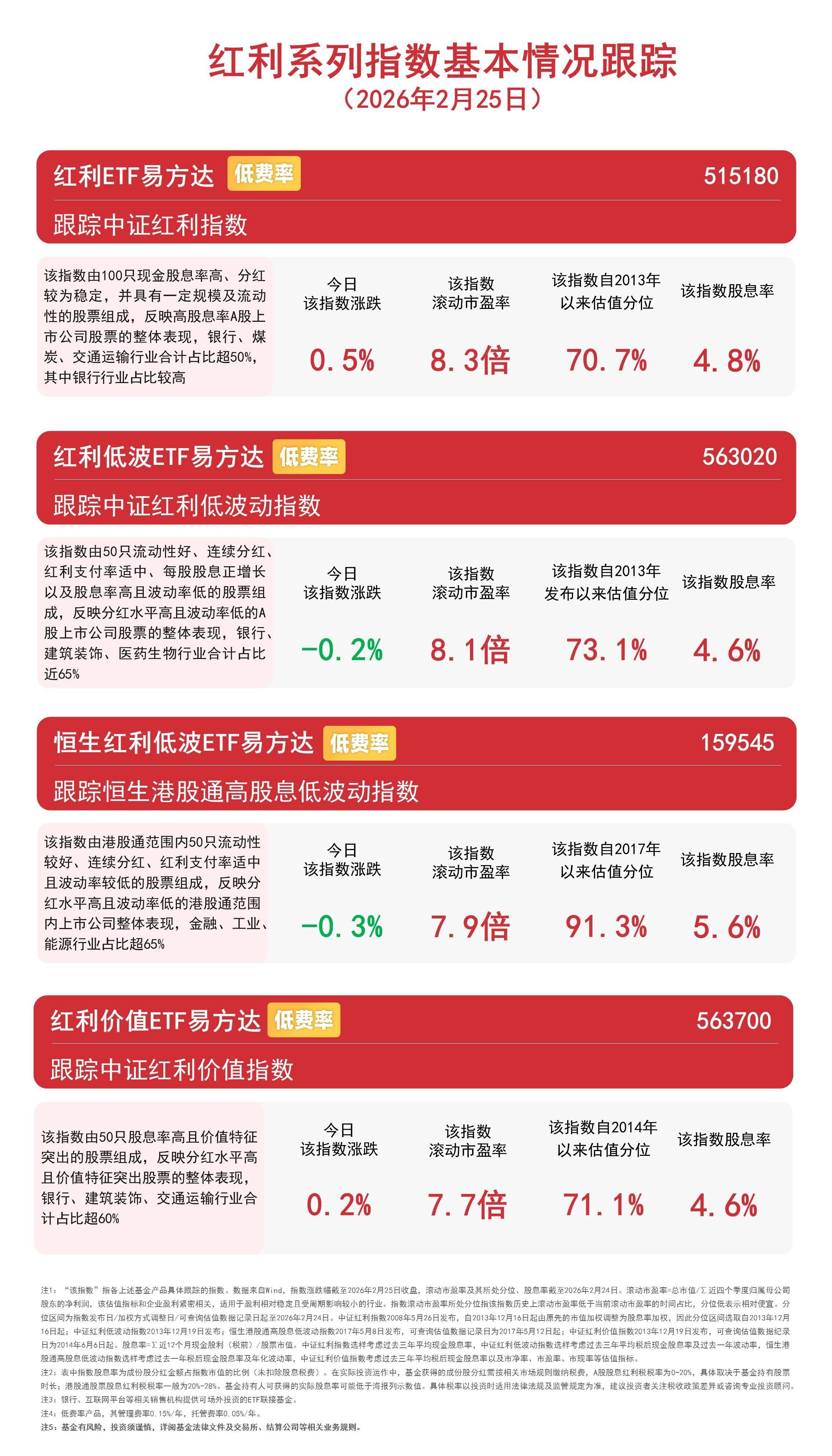 市场表现 - 中证红利指数上涨0.5% [1] - 中证红利价值指数上涨0.2% [1] - 中证红利低波动指数下跌0.2% [1][5] - 恒生港股通高股息低波动指数下跌0.3% [1][9] 资金流向 - 红利低波ETF易方达(563020)近两个交易日连续获资金净流入,合计达1.2亿元 [1] - 恒生红利低波ETF易方达(159545)近两个交易日连续获资金净流入,合计达1.9亿元 [1] 产品与费率 - 易方达基金是目前唯一一家红利类ETF全部实行低费率的基金公司 [1] - 旗下恒生红利低波ETF易方达(159545)、红利ETF易方达(515180)、红利低波ETF易方达(563020)、红利价值ETF易方达(563700)、A500红利低波ETF易方达(563510)等产品的管理费率均为0.15%/年 [1] 指数构成与特点 - 中证红利低波动指数由50只流动性好、连续分红、红利支付率适中、每股股息正增长以及股息率高且波动率低的A股股票组成 [3] - 该指数反映分红水平高且波动率低的A股上市公司股票的整体表现 [3] - 指数中银行、建筑装饰、医药生物行业合计占比约65% [3] - 恒生港股通高股息低波动指数由港股通范围内50只流动性较好、连续分红、红利支付率适中且波动率较低的股票组成 [7] - 该指数反映分红水平高且波动率低的港股通范围内上市公司的整体表现 [7] - 指数中金融、工业、能源行业占比超65% [7]