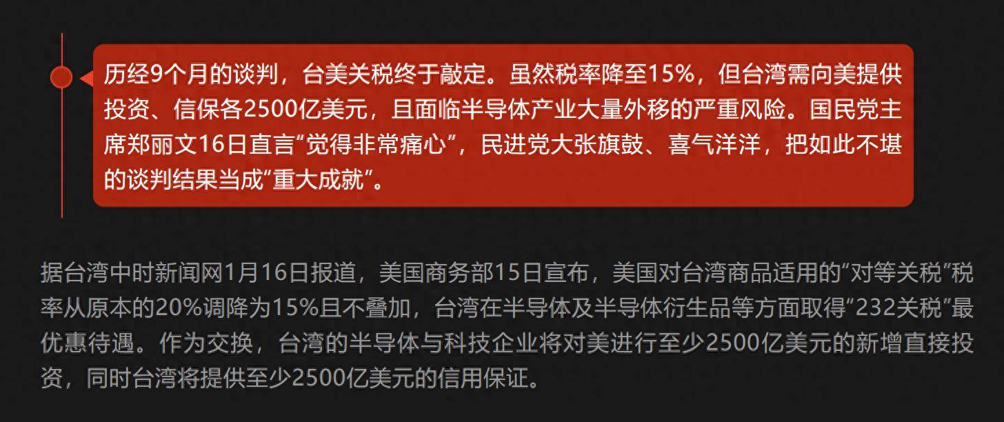 文章核心观点 - 美台贸易协定中台湾地区以高昂的经济与产业代价换取小幅关税减免 该协定被描述为不对等的交易 其核心是台湾地区通过大规模对美投资和产业转移来换取政治好感 而非纯粹商业互惠 [1][2][4] 协议条款与代价 - 台湾地区获得的关税减免为从20%降至15% 降幅为5个百分点 [1] - 为换取该关税减免 台湾地区需向美国提供总额高达5000亿美元的对价 包括至少2500亿美元的直接投资和同等规模的信用保证 [1] - 协议要求台积电在美国亚利桑那州追加建设至少四座晶圆厂 这是在原有六座晶圆厂和两座先进封装设施基础上的进一步加码 [2] - 与美日 美韩协议相比 美国对台湾地区附加了更严苛的条件 [2] 产业与投资影响 - 台湾地区承诺的对美投资额占其GDP的比重高达56.8% 远高于日本的12.8%和韩国的18.8% [2] - 协议将导致台湾地区超过40%的先进半导体产能外流 [9] - 产业外流可能导致台湾地区产业空心化 先进技术 关键研发和完整供应链被美国吸纳 本土仅剩附加值较低的环节并伴随人才流失 [8] - 在台湾本土面临能源转型困境和企业电力不足的背景下 承诺大规模投资美国能源产业被指是从本土产业根基上抽血 [6] 政治动机与后果 - 美国官员直言该协议不仅是商业交易 更是台湾地区为维持美国青睐而必须履行的战略要务 [2] - 台湾地区当局被指出于高度政治依赖和错误战略判断签署协议 意图通过对美提供利益换取安全承诺 [4] - 台湾地区当局被指将短期政治利益置于长期经济健康之上 通过宣传将关税降幅包装为胜利 而将巨额投资代价分期落实并留给未来承担 [6] - 协议被批评为倚美谋独演变为倚美卖台 以掏空重要经济筹码为代价换取政治依附 可能将台湾地区推向更深重的经济 政治和安全依附境地 [8]