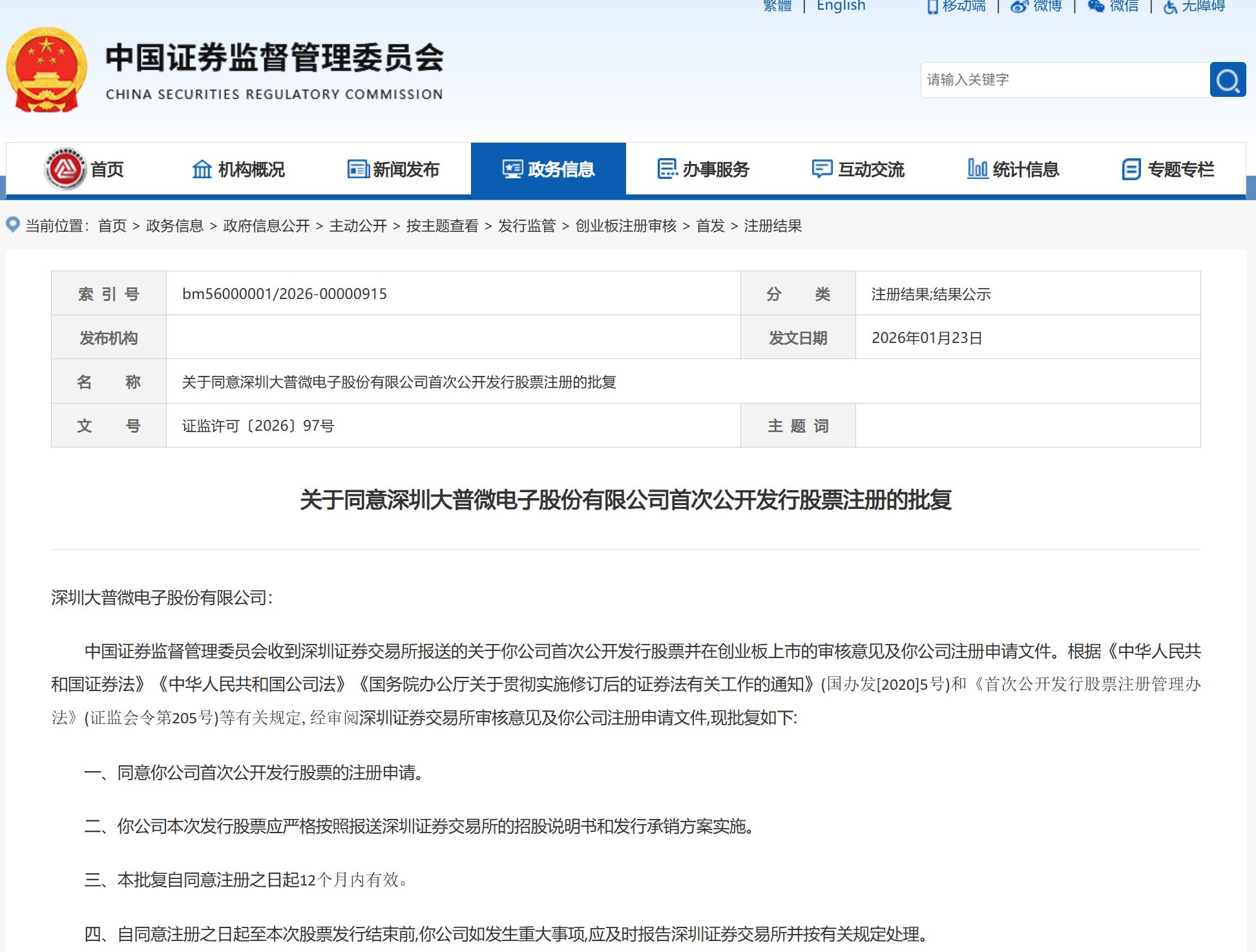 2026年1月23日,证监会官网显示,深圳大普微电子股份有限公司(以下简称"大普微")IPO注册获批,标志着大普微距离登陆资本市场更近一步。 | 索 引 号 | bm56000001/2026-00000915 | | --- | --- | | 发布机构 | | | ম 不 | 关于同意深圳大普微电子股份有限公司首次公开发行股票注册的批复 | | 文 름 | 证监许可〔2026〕97号 | 据悉,大普微主要从事数据中心企业级SSD(固态硬盘)产品的研发销售,是业内领先、国内极少数具备企业级SSD"主控芯片+固件算法+模组"全栈自研能 力并实现批量出货的半导体存储产品提供商。 国产稀缺企业级SSD赛道标的 正迎存储热潮 近期,受到下游AI商业化加速、服务器集群规模扩大等因素驱动,存储市场需求火热、产能紧俏,推动存储产品价格一路高涨。 目前,国内多数存储类上市公司主要在消费级SSD、嵌入式存储方面进行业务布局,核心逻辑在于供应链的规模化与成本优化。与之不同的是,数据中心所 采用的企业级SSD更侧重于处理极端负载情况下的性能一致性与系统稳定性,对于读写速率、时延、数据加密、平均无故障时间(MTBF)等指标要求严 ...
