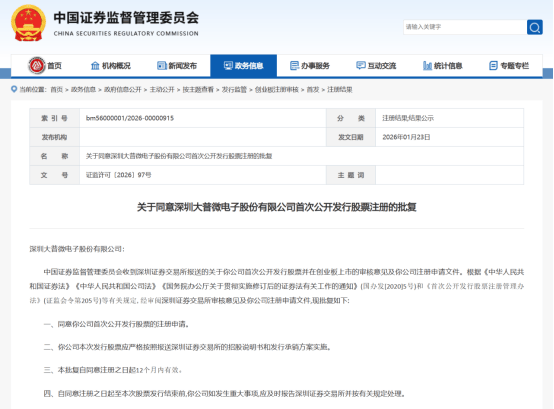 来源:中国证券报-中证网 1月23日,证监会发布关于同意大普微首次公开发行股票注册的批复,标志着创业板首家未盈利企业 IPO注册获批。 通过提高制度弹性和包容性,创业板有效回应了"硬科技"企业研发周期长、研发投入大的现实特征,持 续放大资本市场对实体科技发展的支持效应。 在此过程中,依托创业板的制度实践,资本市场对创新规律的理解日益深化。通过强调技术研发能力、 关键赛道卡位和长期成长空间,创业板为科技企业跨越关键发展阶段提供稳定的资本支撑,也为新质生 产力培育奠定了坚实基础。 此次IPO注册获批的大普微深耕企业级存储核心环节,在主控芯片、固件算法与产品化能力上长期投 入、持续积累,产品服务于AI、数据中心、云计算等关键应用场景,具备鲜明的技术导向与产业属 性。 拓宽优质未盈利企业上市通道 资本市场服务实体经济 效能持续体现 作为我国多层次资本市场中,服务创新成长企业的核心板块,创业板始终围绕支持科技创新这一战略定 位,不断完善制度安排和审核标准,引导社会资本更多投向具备技术深度和产业价值的科技企业。 证监会主席吴清2025年6月18日宣布创业板正式启动第三套标准,支持优质未盈利创新企业上市。 业内人士认为,此 ...