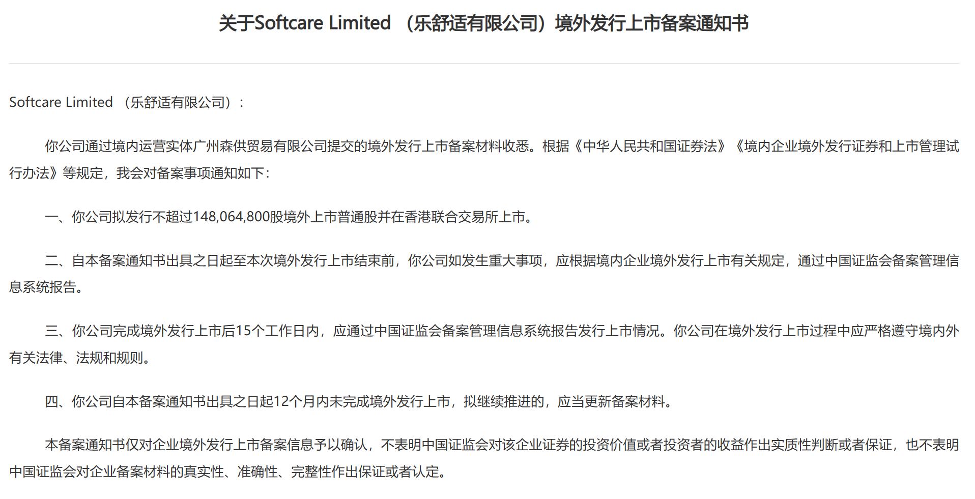 智通财经APP获悉,10月18日,中国证监会国际合作司发布《关于Softcare Limited (乐舒适有限公司)境外发行上市备案通知书》。乐舒适拟发行不超过 148,064,800股境外上市普通股并在香港联合交易所上市。 招股书显示,乐舒适是一家专注于非洲、拉美、中亚等地快速发展新兴市场的跨国卫生用品公司,主要从事婴儿纸尿裤、婴儿拉拉裤、卫生巾和湿巾等婴儿 及女性卫生用品的开发、制造和销售。于往绩记录期间,公司的大部分收入来自向非洲客户的销售。 财务方面,于2022年度、2023年度、2024年度、2024年及2025年截至4月30日止四个月,乐舒适实现收入分别约为3.20亿美元、4.11亿美元、4.54亿美元、 1.40亿美元、1.61亿美元;同期,年度/期间利润分别为1839万美元、6468万美元、9511.1万美元、2765.9万美元、3110.3万美元。 ...
