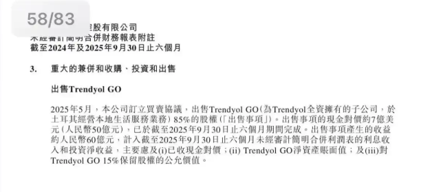 图源:阿里公告截图 公开信息显示,Trendyol GO是土耳其电商巨头Trendyol旗下的即时配送品牌,由阿里旗下Trendyol全资 持有,主打食品、生鲜的分钟级配送服务,2024年全年完成超2亿笔订单,交易额达20亿美元,是土耳 其即时零售市场的核心参与者。 12月4日,阿里巴巴在2026财务年度中期报告中披露,今年5月,阿里订立买卖协议,向全球出行巨头 Uber出售Trendyol GO 85%的股权,以约7亿美元(折合人民币49.49亿元)的现金对价完成交易,出售 事项产生的收益约60亿元,该笔收益已计入2025年上半年投资净收益。此次交易于截至2025年9月30日 的六个月内完成。 阿里巴巴2026财年第二季度财报(自然年2025年第三季度)显示,阿里巴巴营收为2477.95亿元,同比 增长5%。净利润为206.12亿元,同比下滑53%。阿里巴巴即时零售业务收入达到229.06亿元人民币,较 上年同期的143.21亿元增长60%。 招商证券分析称,未来看好阿里巴巴电商主业稳固竞争力、外卖业务成长空间以及云与AI业务长期增 长潜力,预计FY2026-2028年Non-GAAP归母净利润,分别能达到 ...