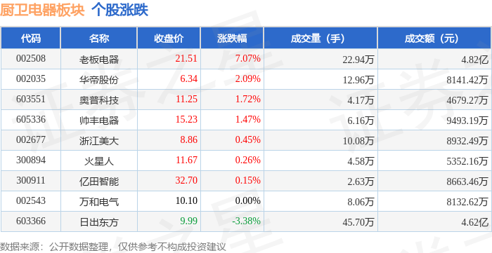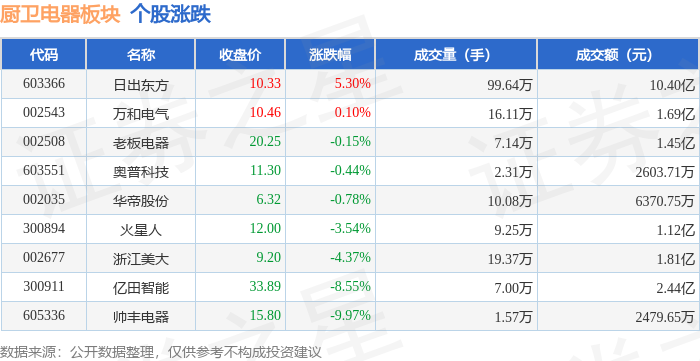 从资金流向上来看,当日厨卫电器板块主力资金净流出2114.68万元,游资资金净流入3680.22万元,散户 资金净流出1565.54万元。厨卫电器板块个股资金流向见下表: 证券之星消息,1月27日厨卫电器板块较上一交易日下跌0.57%,帅丰电器领跌。当日上证指数报收于 4139.9,上涨0.18%。深证成指报收于14329.91,上涨0.09%。厨卫电器板块个股涨跌见下表: | 代码 | 名称 | 收盘价 | 涨跌幅 | 成交量(手) | 成交额(元) | | --- | --- | --- | --- | --- | --- | | 603366 | 日出东方 | 10.75 | 4.07% | 95.63万 | 10.15 Z | | 002508 | 老板电器 | 20.11 | -0.69% | 6.92万 | · 1.39亿 | | 002677 | 浙江美大 | 9.12 | -0.87% | 13.10万 | 261T | | 300894 | 火星人 ▼ | 11.89 | -0.92% | 5.35万 | 6330.28万 | | 603551 | 奥普科技 | 11.18 | -1.06% ...