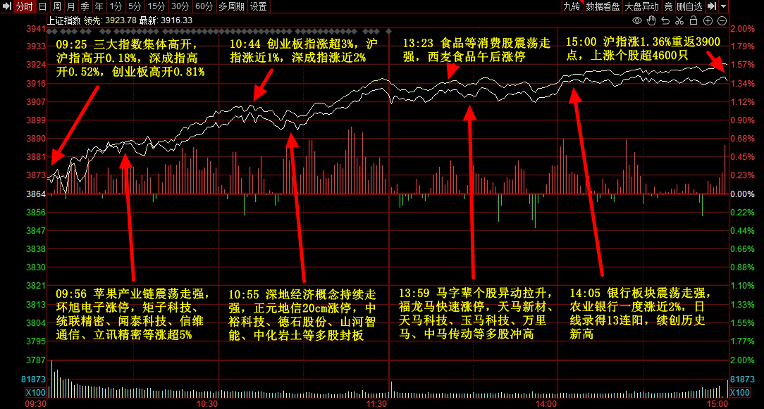准确 快速 权威 专业 7x24h电报 头条新闻 VIP资讯 实时盯盘 今日A股市场冲高回落,三大指数盘中一度集体翻绿。 沪深两市成交额1.93万亿,较上一个交易日缩量1417亿,自9月10日以来再度失守2万亿。 盘面上,市场热点较为杂乱,全市场近4200只个股下跌。从板块来看, 煤炭板块延续强势,大有能源午后回封涨停 ,走出5天4板。港口航运板块表 现活跃,海通发展等多股涨停。医药板块局部走强,贵州百灵、罗欣药业双双涨停。银行板块集体上涨,农业银行盘中逼近历史高点。下跌方面, 可控核聚变概念股集体大跌,合锻智能触及跌停。 下载财联社APP获取更多资讯 板块方面,煤炭、保险、港口航运等板块涨幅居前,贵金属、半导体、风电等板块跌幅居前。 截至收盘,沪指涨0.1%,深成指跌0.25%,创业板指涨0.38%。 ...
