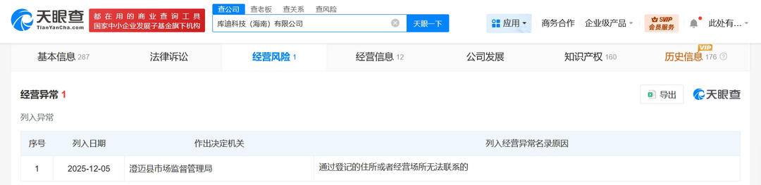扬子晚报网12月9日讯(记者陈哲 实习生 潘伊笑)近日,知名连锁咖啡品牌库迪咖啡(Cotti Coffee)旗下一家科技公司因"通过登记的住所或者经营场所 无法联系",被海南省澄迈县市场监督管理局列入经营异常名录,引发市场关注。 库迪咖啡是由瑞幸咖啡创始人陆正耀、钱治亚等人于2022年再次创业推出的咖啡品牌,自诞生之初便以激进的扩张策略和价格战闻名。其旗下设立多家科 技、供应链、管理公司,被外界视为其构建品牌生态、支撑快速开店的重要布局。库迪科技(海南)有限公司便是其中之一。海南作为自由贸易港,享有 税收优惠、投资便利等政策红利,近年来吸引大量企业前往注册。库迪咖啡在海南设立科技公司,很可能意在利用当地政策优势,进行品牌管理、供应链 协调或开展相关创新业务。 此次经营异常事件发生在库迪咖啡全国门店数量迅速增长、与竞争对手激烈交锋的背景下,引发了业界对其内部管理、合规运营以及快速扩张背后稳健性 的关注。 记者走访南京地区库迪咖啡门店,销售人员告知对此事件并不知情,目前销售及加盟一切正常。 业内人士指出,对于正在高速扩张的连锁品牌而言,旗下重要子公司出现经营异常信号,可能反映出公司在跨区域管理、合规手续跟进或内部 ...