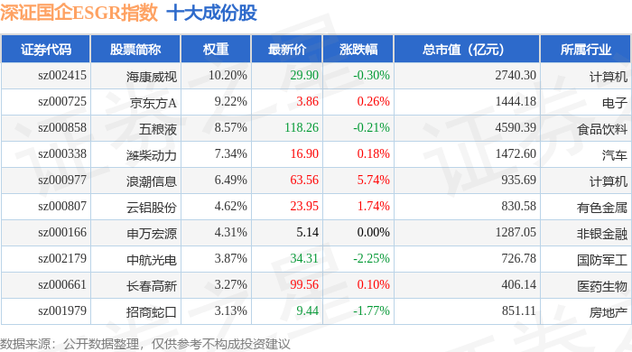 深证国企ESGR(470055)指数十大成份股详情如下: 证券之星消息,11月26日,深证国企ESGR(470055)指数报收于1552.92点,涨0.31%,成交275.22亿 元,换手率0.83%。当日该指数成份股中,上涨的有16家,泰达股份以10.07%的涨幅领涨,下跌的有31 家,中来股份以4.21%的跌幅领跌。 | 证券代码 | 股票简称 | 权重 | 最新价 | 涨跌幅 | 总市值(亿元) | 所属行业 | | --- | --- | --- | --- | --- | --- | --- | | sz002415 | 海康威视 | 10.20% | 29.90 | -0.30% | 2740.30 | 计算机 | | sz000725 | 京东方A | 9.22% | 3.86 | 0.26% | 1444.18 | ● 电子 | | sz000858 | 五粮液 | 8.57% | 118.26 | -0.21% | 4590.39 | 食品饮料 | | sz000338 | 潍柴动力 | 7.34% | 16.90 | 0.18% | 1472.60 | 汽车 | | sz000977 | ...