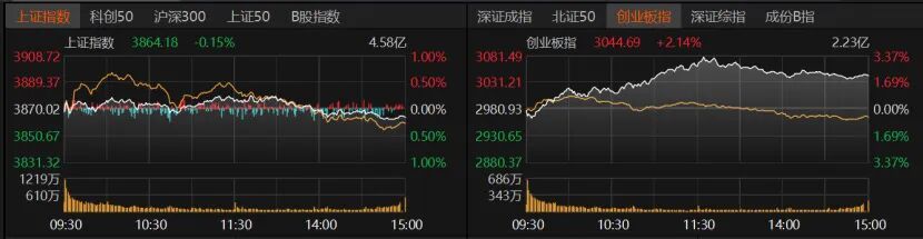 11月26日,A股走势分化,光通信模块等科技股大涨带动深市跑赢沪市,创业板指涨逾2%。市场交投略有降温,成交 额缩至1.8万亿元,3593只个股收跌。 受访人士表示,当前市场套牢盘压力较大、外资流入缓慢,内外资分歧明显,观望情绪浓厚。投资者需密切关注中日 冲突事件进展、美联储12月是否降息,以及即将举行的中央经济工作会议。操作上建议仓位控制在50%左右,逢低布 局通信等强势赛道龙头股,并配置银行、医药等防御板块对冲风险。 算力、CPO大爆发 沪深两市走势分化。沪指午后走低,最后收跌0.15%报3864.18点;创业板指午后进一步走强,收涨2.14%报3044.69 点。深证成指涨逾1%。科创50、沪深300、上证50涨幅均不超过1%,北证50收跌。 成交缩量,今日成交额降至1.8万亿元。杠杆资金小幅回流,截至11月25日,沪深京两融余额增至2.46万亿元。 盘面上,算力概念、CPO(光电共封装)概念、光通信模块、F5G概念、Chiplet概念继续大涨,半导体、电子元件、 化学制药、消费电子、白色家电等概念涨势也不错。但银行、军工等概念领跌。 | 东财概念指数 | | | 东财行业指数 | | | | A股市场 ...