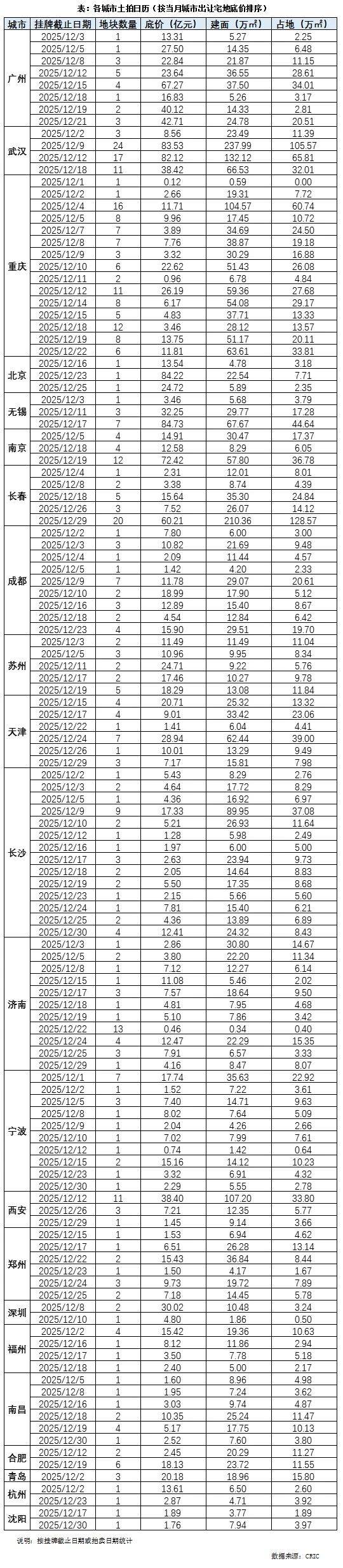 2025年12月重点城市土拍一览 西安本月共计15宗地出让