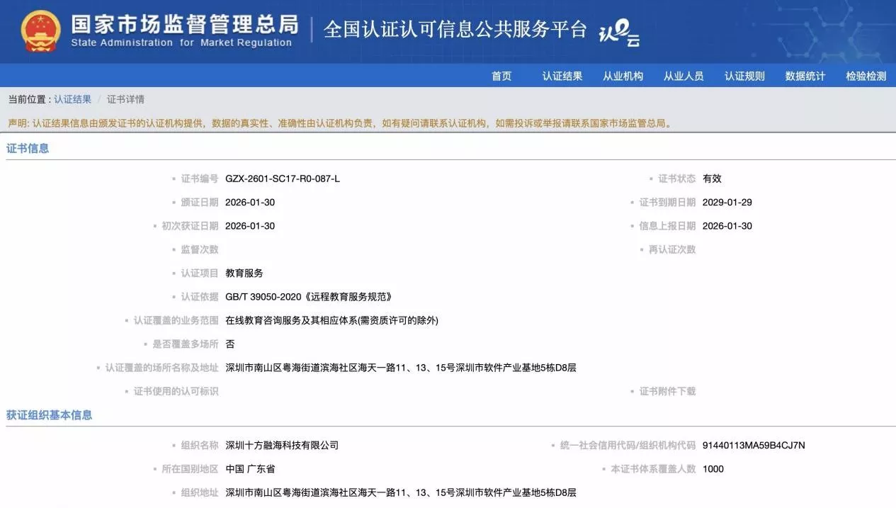 十方融海梨花教育荣获国家市场监督管理总局CNCA五星认证