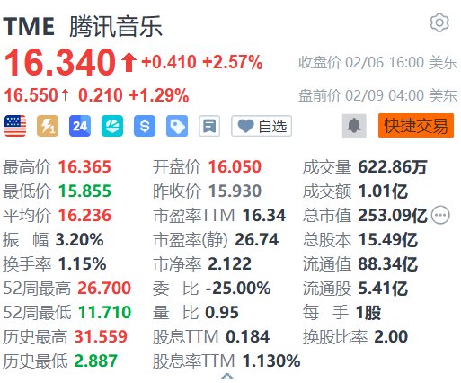 美股异动丨腾讯音乐盘前续涨超1% 花旗料其上季业绩符预期或略胜预期