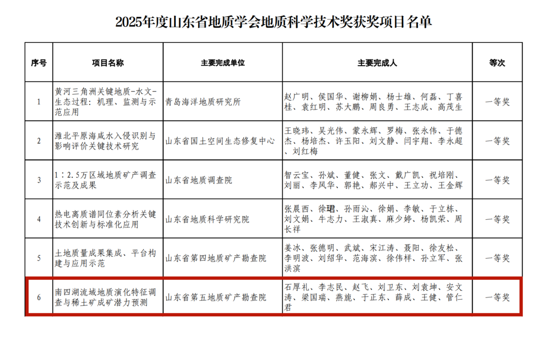 | 序号 | 姓名 | 工作单位 | | --- | --- | --- | | 1 | 乔淑卿 | 自然资源部第一海洋研究所 | | 2 | 刘华峰 | 山东省地质调查院 | | 3 | 李增胜 | 山东省地质科学研究院 | | 4 | 张海瑞 | 山东省第四地质矿产勘查院 | | 5 | 徐洪岩 | 山东省第五地质矿产勘查院 | | 6 | 刘苏哲 | 山东省鲁北地质工程勘察院 | | 7 | 张英梅 | 山东省鲁南地质工程勘察院 | | 8 | 张秀文 | 山东省物化探勘查院 | | g | 刘兴金 | 山东省煤田地质局物探测量队 | | 10 | 王明 | 山东省煤田地质规划勘察研究院 | 近年来,五队持续深化科技创新体系建设,依托科研平台和专业技术团队,不断完善科技管理机制,坚持以项目为载体、以创新为驱动、以人才为支撑, 持续推动产学研用深度融合,科技创新能力和人才队伍建设水平稳步提升。在地质找矿、城市地质、地质资源环境数据等重点领域取得一系列阶段性成 果。特别是在稀土资源勘查领域,围绕深部找矿关键技术难题,创新构建稀土矿勘查技术体系,建立了鲁西"碳酸岩—碱性岩型"稀土成矿模型,填补了区 域成矿理论 ...