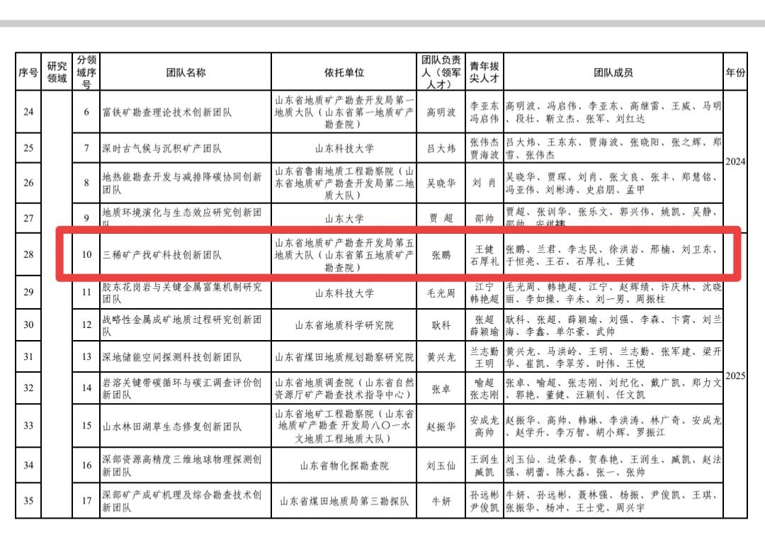 喜讯!山东省地矿局五队入选省自然资源高层次科技创新人才团队(储备)