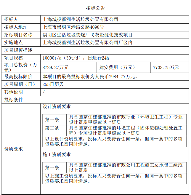 7984万!上海城投瀛洲垃圾飞灰资源化技改项目总承包招标