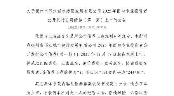 12月17日,上交所发布关于扬州市邗江城市建设发展有限公司2025年面向专业投资者公开发行公司债券 (第一期)上市的公告。 来源:市场资讯 依据《上海证券交易所公司债券上市规则》等规定,上交所同意扬州市邗江城市建设发展有限公司2025 年面向专业投资者公开发行公司债券(第一期)于2025年12月18日起在上交所上市,并采取匹配成交、 点击成交、询价成交、竞买成交、协商成交交易方式。该债券证券简称为"25邗江G1",证券代码 为"244401"。 ...