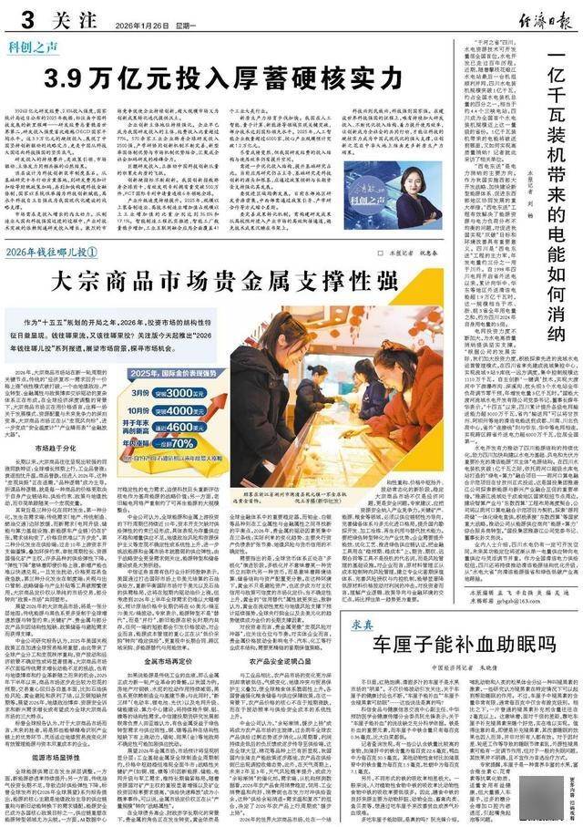 黄金与贵金属投资 - 2026年黄金在流动性宽松与地缘风险支撑下预计延续强势[6] - 全球央行购金以及去美元化趋势成为金价的长期支撑因素[6] - 贵金属在投资组合中扮演“宏观风险对冲器”的角色[6] 银行理财市场趋势 - 当前市场存在“存款搬家”的讨论,但百姓储蓄倾向仍保持较高水平,风险偏好未发生根本转变[11] - 单纯依赖传统固收策略已难以满足财富保值增值需求[12] - “固收+”及多资产多策略产品成为现实选择,旨在控制整体波动的前提下适度增强收益弹性[12] 基金市场投资方向 - 2026年基金市场机会依然不少,科技赛道愈发清晰[13][17] - 业内人士建议提升ETF在资产组合中的配置比例[17] - ETF产品兼具费率低廉、分散度高、交易灵活等优势,可通过宽基ETF把握大盘红利或借助行业主题ETF布局景气赛道[17] 2026年整体投资展望 - 2026年是“十五五”规划的开局之年,投资市场结构性特征日益显现[1] - 大宗商品市场中的贵金属支撑性强,但市场趋于分化[3] - 2026年1月26日有3.9万亿元投入以厚蓄硬核实力[2]