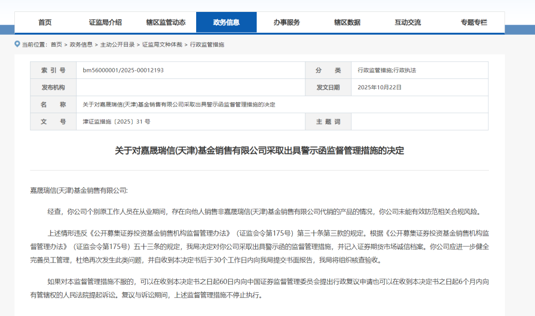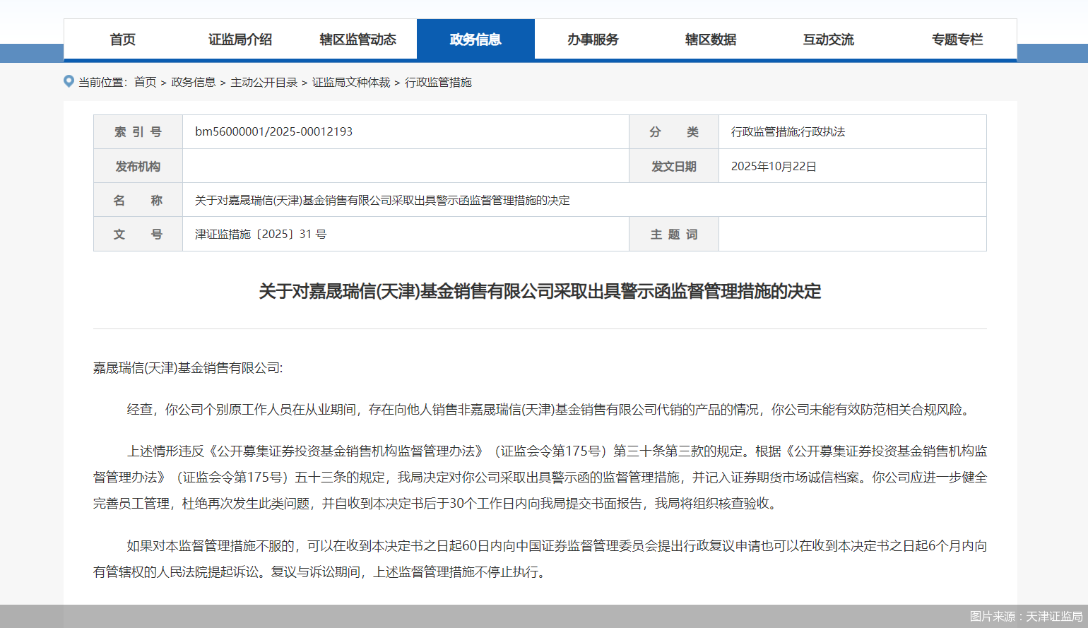 基金代销监管持续趋严,又有基金销售机构接到监管罚单。 天津证监局发布的行政监管措施决定书显示,对嘉晟瑞信(天津)基金销售有限公司(以下简称嘉晟瑞信(天津)基金)前从业人员郑某某采取出具警示 函的监管措施,因其在从业期间存在销售非公司代销产品的违规行为。同时,嘉晟瑞信基金也被监管出具警示函。 今年以来,多家销售机构因基金销售过程中存在违规行为被监管机构开出罚单,涉及的违规行为包括销售人员不具备基金从业资格、营销活动不合规等。 嘉晟瑞信(天津)基金被罚 监管继续对基金销售机构违规行为保持"高压"态势。 10月22日,天津证监局披露的罚单显示,郑某某在嘉晟瑞信(天津)基金从业期间,存在向他人销售非嘉晟瑞信(天津)基金销售有限公司代销的产品的 情况。上述情形违反《证券期货经营机构及其工作人员廉洁从业规定》(证监会令第202号)第十条第(四)项的规定。 根据《证券期货经营机构及其工作人员廉洁从业规定》(证监会令第202号)第十八条的规定,天津证监局决定对其采取出具警示函的监督管理措施,并 记入证券期货市场诚信档案。 与此同时,郑某某所在公司也被处罚。行政监管措施决定书显示,嘉晟瑞信(天津)基金未能有效防范相关合规风险, ...