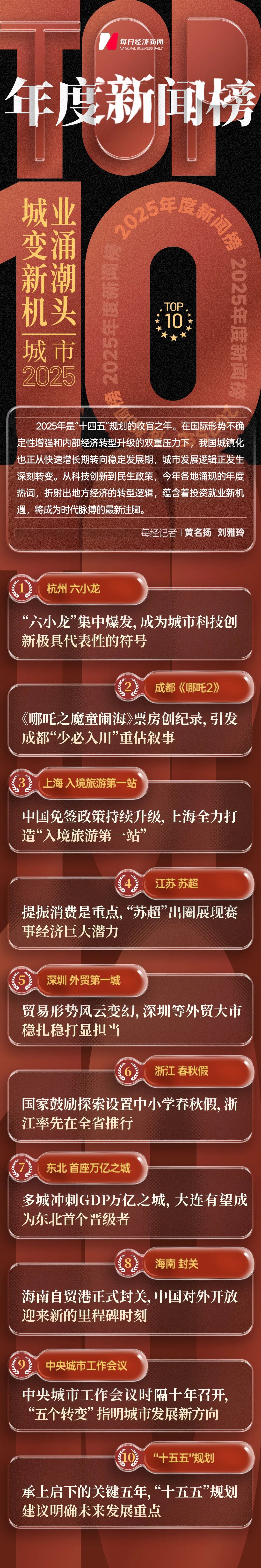 每经记者|黄名扬 刘雅玲 每经编辑|刘艳美 2025年是"十四五"规划的收官之年。在国际形势不确 定性增强和内部经济转型升级的双重压力下,我国城镇化 也正从快速增长期转向稳定发展期,城市发展逻辑正发生 深刻转变。从科技创新到民生政策,今年各地涌现的年度 热词,折射出地方经济的转型逻辑,蕴含着投资就业新机 调,将成为时代脉搏的最新注脚。 每经记者 | 黄名扬 刘雅玲 "六小龙"集中爆发,成为城市科技创 新极具代表性的符号 成都《哪吒之》 《哪吒之魔童闹海》票房创纪录,引发 成都"少必入川"重估叙事 杭州 六小龙 上海 入境旅游第一站 中国免签政策持续升级,上海全力打 造"入境旅游第一站" 江苏苏超 提振消费是重点,"苏超"出圈展现赛 事经济巨大潜力 深圳 外贸第一城 贸易形势风云变幻,深圳等外贸大市 稳扎稳打显担当 浙江 春秋假 国家鼓励探索设置中小学春秋假, 浙 江率先在全省推行 东北 首座万亿之城 多城冲刺GDP万亿之城,大连有望成 为东北首个晋级者 海南 封关 海南自贸港正式封关,中国对外开放 迎来新的里程碑时刻 中央城市工作会议 中央城市工作会议时隔十年召开, "五个转变"指明城市发展新方向 "十五五" ...
