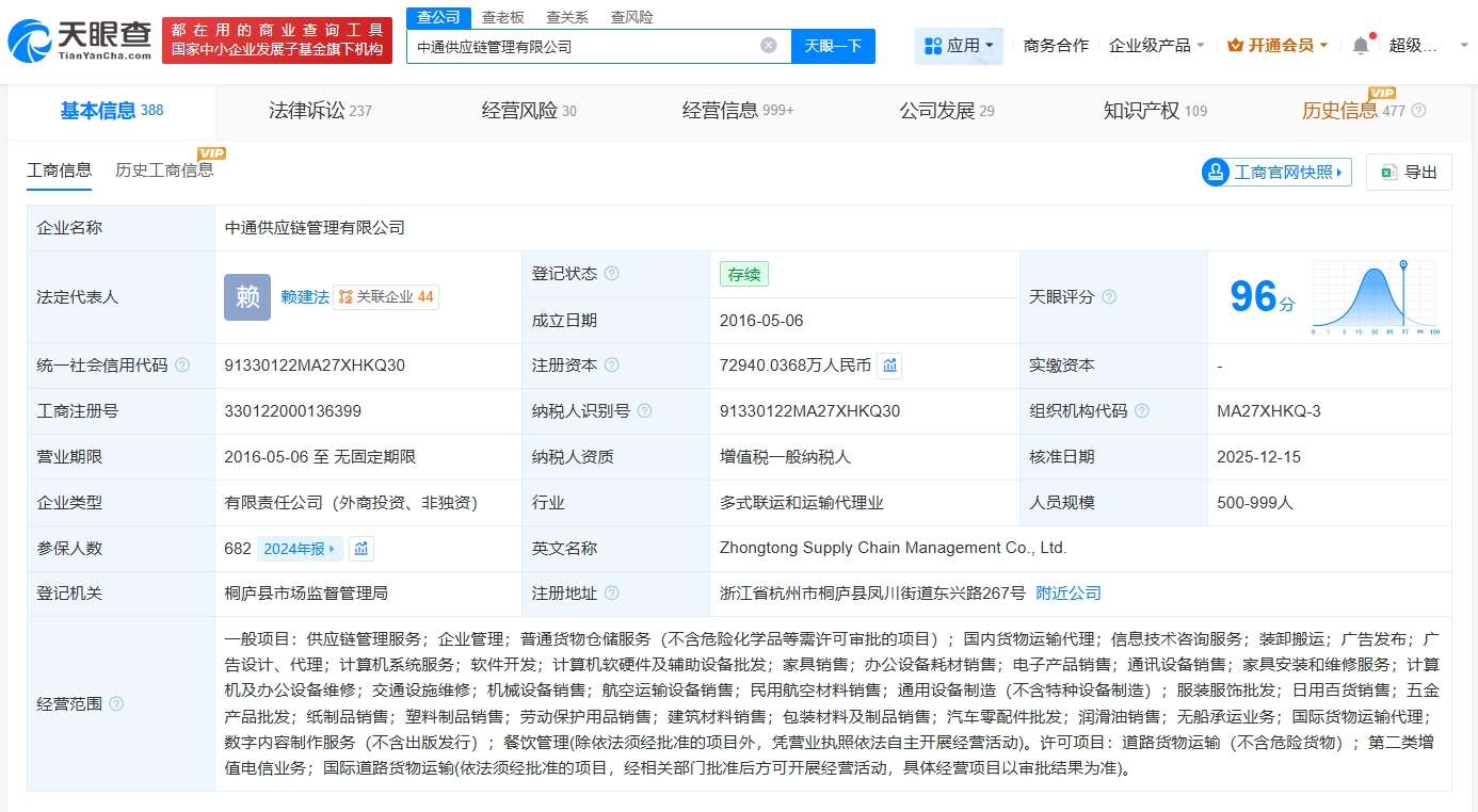 每经AI快讯,天眼查App显示,近日,中通供应链管理有限公司发生工商变更,注册资本由约6亿元人民币增至约7.3亿元人民币,增幅约21%。该公司成立 于2016年5月,法定代表人为赖建法,经营范围包括供应链管理服务、企业管理、普通货物仓储服务、国内货物运输代理等。股东信息显示,该公司由杭州 驰运股权投资有限公司、赖建法、赖梅松等共同持股。 | 大眼管 | | 都在用的商业查询工具 | 查公司 查老板 查关系 查风险 | | | | | | --- | --- | --- | --- | --- | --- | --- | --- | | | | 国家中小企业发展子基金旗下机构 | 中通供应链管理有限公司 | (x) | 天眼一下 | 船 应用 ▼ | 商务合作 企业级产 | | 基本信息 388 | | 法律诉讼 237 | 经营风险 30 | 经营信息 999+ | | 公司发展 29 | 知识产权 | | 变更记录 69 0 ● | | | | | | | 变更项目 ▼ ইছ | | 序号 | 变更日期 | 变更项目 | 变更前 | | | | | | 1 | 2025-12-15 | 外商投资企业法律文件 ...