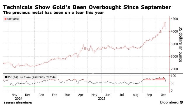 在上周多日连续创新高后,贵金属市场突然转向。10月21日周二,金银遭遇多年来罕见暴跌。 截至周一连续第六个交易日创盘中历史新高的黄金创十二年来最大跌幅。美股早盘时段刷新日低时,现货黄金逼近4082美元,日内跌约6.3%,创2013年4月 以来最大日内跌幅,纽约期金跌至4093美元,日内跌6.1%。 白银也在美股早盘刷新日低,现货白银跌至47.90美元下方,日内跌近8.7%,创2021年2月以来最大盘中跌幅,纽约期银跌至47.12美元,日内跌约8.3%。 多重因素共同施压贵金属价格。投资者关注据称下周的会谈,预期贸易紧张局势将因此缓和,削弱了贵金属的避险需求。此外,还有美元走强、技术指标超 买以及投资者持仓不透明等因素交织,终结了此前贵金属的涨势。 此次抛售正值美国政府关门导致关键持仓数据缺失。盛宝银行的大宗商品策略师Ole Hansen警告,投机性多头头寸可能已大幅累积,使金银更容易遭遇回 调。印度季节性购买热潮结束也加剧了市场压力。 尽管跌幅剧烈,仍有分析师认为,支撑贵金属上涨的基本面因素还未改变,潜在买盘或将限制回调幅度。 技术面超买引发获利了结 持仓数据缺失加剧不确定性 彭博策略师Tatiana Dar ...