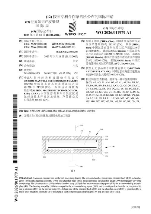 迈为股份公布国际专利申请: "真空腔体及太阳能电池加工设备"