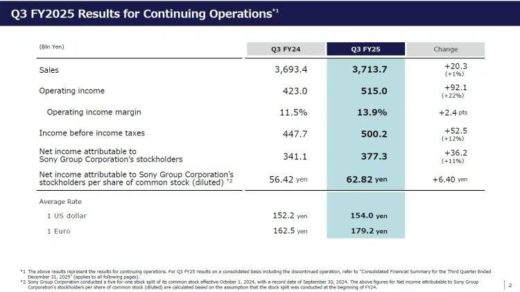 索尼集团发布2025财年第三季度财报 营业利润同比增长22%,全年预期上调