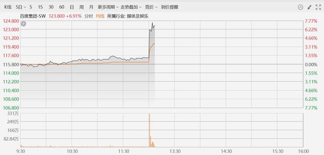| | | K线 5日~ 5 15 30 60 日 周 月 更多周期~ 走势叠加 ~ 竞价~ 到价提醒 | | | | | | 0 1 3 | | --- | --- | --- | --- | --- | --- | --- | --- | --- | | | | 百度集团-SW 123.800 +6.91% 分时 均线 所属行业: 媒体及娱乐 | | | | | | | | 124.800 | | | | | | | | 7.77% | | 123.000 | | | | M | | | | 6.22% | | 121.200 | | | | | | | | 4.66% | | 119.400 | | | | | | | | 3.11% | | 117.600 | | winn | | | | | | 1.55% | | 115.800 mm | | | | | | | | 0.00% | | 114.000 | | | | | | | | 1.55% | | 112,200 | | | | | | | | 3.11% | | 110.400 | | | | | | | | 4.66% | | 108.6 ...
