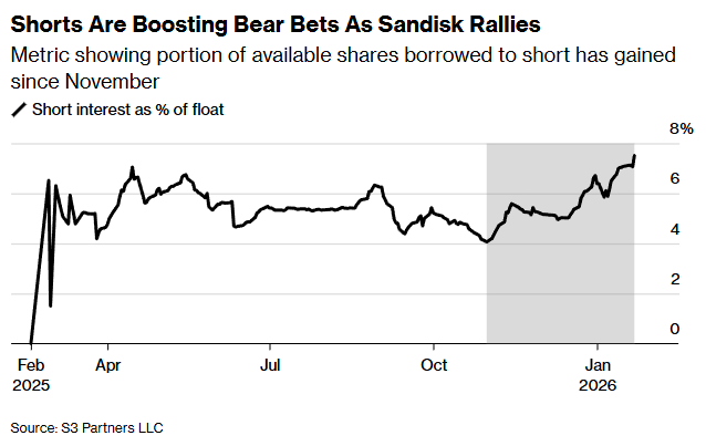 智通财经APP获悉,根据S3 Partners LLC的数据,随着存储芯片厂商Sandisk(SNDK.US)股价大幅上涨, 该股的空头仓位在过去数月持续攀升,轧空风险已达到"极端"水平。 继去年暴涨577%后,Sandisk股价今年以来已累计大涨112%,远远跑赢标普500指数约1%的涨幅,并跻 身2026年该指数表现最强劲的个股之列。自重新上市以来,Sandisk股价已累计上涨约1300%。S3 Partners表示,此轮上涨发生在人工智能(AI)交易主题向存储芯片类股票轮动之际,同时全球存储芯片短 缺使该公司得以上调价格。 存储芯片股尽享"AI基建超级红利" 在刚刚过去的2025年,存储芯片股票以及存储类高端产品股票毋庸置疑是全球股票市场最火热的投资主 题之一,在2026年开年同样如此。除了Sandisk之外,美光科技(MU.US)、西部数据(WDC.US)、希捷科 技(STX.US)今年迄今同样股价大涨。 即便经历了涨势如虹般的2025年超级牛市轨迹,以及牛市势头仍在延续的2026年开年,全球投资者们并 未为这些存储芯片类股票突然走高的估值而感到过度紧张,因为他们相信前所未有的AI数据中心建设 狂潮正 ...