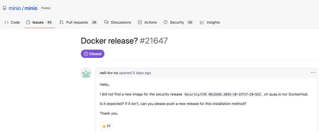 事件概述 - MinIO公司于2025年10月15日发布针对安全漏洞的CVE合规版本后,用户发现DockerHub和Quayio等平台上的官方镜像消失,只能在GitHub上提问 [1] - MinIO核心开发者随后确认,MinIO目前只提供源码分发,用户如需容器镜像需自行构建 [3] - 此决定在开源社区引发巨大争议,相关话题登上Hacker News热门榜单 [4][8] MinIO项目背景 - MinIO是一款高性能分布式对象存储系统,采用GNU AGPL v30许可证,兼容Amazon S3 API [5] - 项目在GitHub上拥有56K Star和63K Fork,拥有超过1,400个依赖包,在Docker Hub上的下载量超过10亿次 [5] - 在国内市场,MinIO被阿里巴巴、腾讯、百度、华为、中国移动等超过9,000家企业采用 [5] 政策变更的具体内容与影响 - MinIO停止提供社区版的预编译二进制版本和官方Docker镜像,仅以源码形式分发 [11][12] - 用户安装最新版MinIO社区版需从源码安装或使用提供的Dockerfile自行构建镜像 [13] - 此变更增加了用户的运维难度和潜在安全风险,尤其对安全合规要求高的企业影响巨大 [7] - 用户批评此举缺乏提前公告,影响了现有部署计划,且CVE合规镜像不再提供可能导致安全隐患 [7][9] MinIO的商业化路径演变 - MinIO最初采用Apache 20许可证,后于2021年将开源协议改为APGLv3,要求服务提供者开放源代码 [10] - 2025年5月,MinIO社区版移除了控制台管理功能,以降低免费版本维护成本并推动企业版商业化 [10] - 停止分发免费Docker镜像是其最新举措,旨在降低免费维护成本并应对部分大公司“白嫖”而不贡献回社区的问题 [10][11] 社区反应与潜在后果 - 社区用户表达强烈不满和担忧,部分用户已开始迁移至其他S3兼容方案如RustFS [17] - 社区内出现呼吁分叉MinIO项目的声音,认为公司免费分发软件无法盈利后转向收费的模式损害了用户信任 [9][18] - 有观点认为,MinIO此举早有征兆,例如其开源版本文档在几周前已被弃用和维护 [14] - 也有声音为MinIO辩护,认为免费提供官方容器镜像需要成本,公司转向商业化在现实角度可以理解 [21]