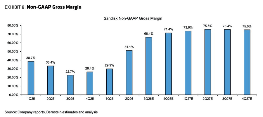 核心观点 - 伯恩斯坦分析师基于闪迪强劲的业绩与超预期的未来指引,将其目标价从580美元大幅上调72%至1000美元,认为公司正进入由数据中心和AI需求驱动的“超级盈利周期”,且当前估值仍具吸引力 [1][10] 财务表现与预测 - 2026财年第二季度收入达30亿美元,同比增长31%,超出市场预期13.2% [2] - 第二季度Non-GAAP毛利率达52.1%,远超市场预期的42%,运营利润率达37.5%,远超市场预期的24.4% [2] - 第二季度Non-GAAP每股收益为6.20美元,超出市场预期77.4% [2] - 第三季度收入指引为44-48亿美元,环比增长53%,Non-GAAP毛利率指引高达65-67%,Non-GAAP每股收益指引达12-14美元 [6] - 分析师将2026财年每股收益预测上调至38.92美元,将2027财年每股收益预测上调至90.96美元,后者较市场共识高出188% [7] - 预测2027财年收入为257.66亿美元,毛利率高达74.9%,运营利润率达65.2%,调整后自由现金流达137.82亿美元 [7][11] 利润率扩张驱动因素 - 平均售价(ASP)环比飙升超过35%,远超市场预期的16%,是利润率扩张的关键驱动力 [2] - 单位成本在第二季度下降约9%,部分归因于工厂启动成本从上季度的7200万美元降至2400万美元,且预计未来将完全消除 [5] - 产品组合优化,公司战略性地将供应优先分配给数据中心等高价值市场 [8] 需求与市场动态 - 数据中心是本季度增长最快的细分市场,环比增长64%,目前占总收入约15% [8] - 管理层已将数据中心2026年的需求增长展望上调至高达60%多的艾字节(EB)增长,并预计数据中心将在2026年成为NAND行业最大的终端市场 [8] - 基于新的AI系统架构,管理层认为可能在2027年推动额外75-100 EB的NAND需求,2028年需求可能接近翻倍 [9] - 公司超过90%的销售基于短期合同,但正在评估转向长期协议以实现更可持续的定价,并已签署一份包含预付款的长期协议 [6] 估值分析 - 1000美元目标价基于11倍2027财年每股收益预测,对应企业价值/自由现金流(EV/FCF)倍数仅为10.3倍,较市场共识估值高出195% [1][10] - 以1月29日收盘价539.30美元计算,目标价隐含85%的上涨空间 [10] - 当前股价对应2026财年市盈率13.9倍,2027财年市盈率仅5.9倍,远低于科技股平均水平 [10] - 尽管公司股价年初至今已上涨127.2%,过去12个月上涨超过1100%,但分析师认为基于未来盈利增长潜力,估值仍有上行空间 [10]