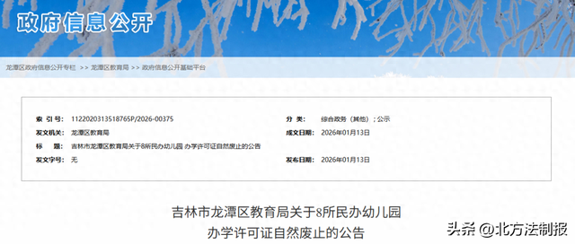 政府监管行动 - 吉林市龙潭区人民政府于1月13日发布公告,宣布该区8所民办幼儿园的办学许可证自然废止[1] - 此举旨在规范民办学前教育办学秩序,维护教育公平与社会公共利益,依据是《中华人民共和国民办教育促进法》及其实施条例[3] 许可证废止原因与依据 - 经核查,截至2025年12月31日,该8所民办幼儿园存在不申报年检、无实际办学行为、办学许可证期满未延续等情形[3] - 根据相关法规,民办学校无实际招生、办学行为的,办学许可证到期后自然废止,审批机关予以公告[3] - 因此,该8所民办幼儿园办学许可证到期后已自然废止,不再具备法律效力[3] 法律后果与后续要求 - 自公告发布之日起,上述幼儿园不再拥有办学资格,其此后从事的任何形式办学活动所产生的一切法律后果,均由相关责任人员自行承担[3] - 相关民办幼儿园需自公告之日起,依法组织清算工作,并在清算结束后向登记机关办理注销登记手续[3] 受影响幼儿园名单 - 共有8所民办幼儿园受到影响,具体名单包括:吉林市龙潭区多元阶梯幼儿园、博雅幼儿园、金蓓蕾幼儿园、东方游泳幼儿园、大风车幼儿园、甜甜宝贝幼儿园、金桥幼儿园、缸窑镇站前幼儿园[5]