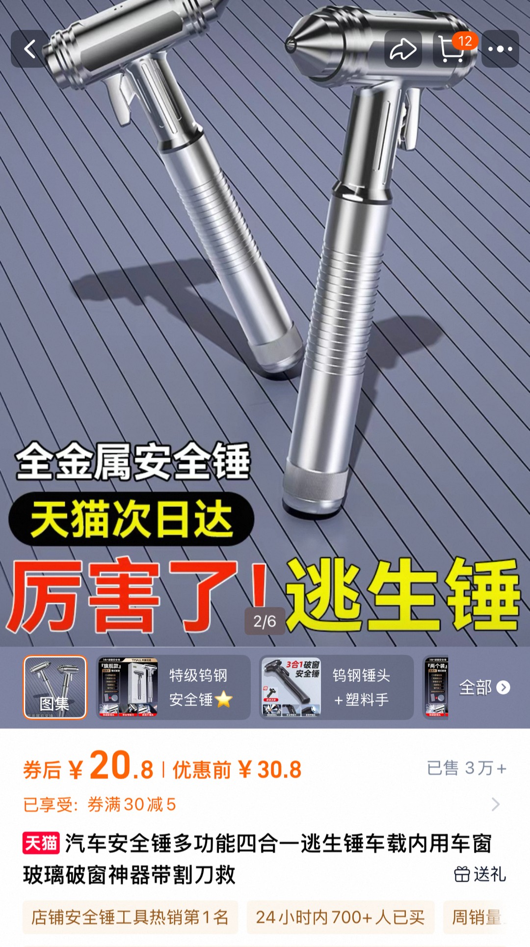 这一数据并非孤例,重大安全事件往往能显著推动相关安全产品的销售。据报道,此前北京一场暴雨后,淘宝上破窗锤销量曾环比增长598%。 "顾客通常都会咨询能不能、如何能击碎汽车玻璃?"特别是随着双层夹胶玻璃在新能源汽车中的普及,破窗锤的有效性更受关注。该工作人员表示,目前 店铺内最畅销的是锤型全金属破窗锤,集尖锤、平锤、安全带割刀于一体,因造型通俗易懂、使用简单而受消费者青睐。 齐鲁晚报.齐鲁壹点郭辰昊 13日凌晨,一起新能源汽车碰撞后起火、车门无法打开的交通事故引发广泛关注。尽管事故具体原因有待官方进一步调查,但现场"众人尝试砸窗救援未 果"的画面,瞬间点燃了公众对车载应急逃生设备的高度关注。 事件发生后迅速引发了破窗锤市场的强烈反应。淘宝商家卡姿汽车用品专营店工作人员告诉记者,往常店铺内破窗锤一天只能卖出十几单,而事故发生后 的一天时间内,已经卖出近800单,销量增长近70倍。 浙江消防测试结果显示,不同类型的破窗锤使用方法有较大差异。撞针式破窗锤基本可以做到一击即中,而锤型破窗锤需要注意尽量敲击玻璃的四角,而 非更为坚固的中间部分。 ...