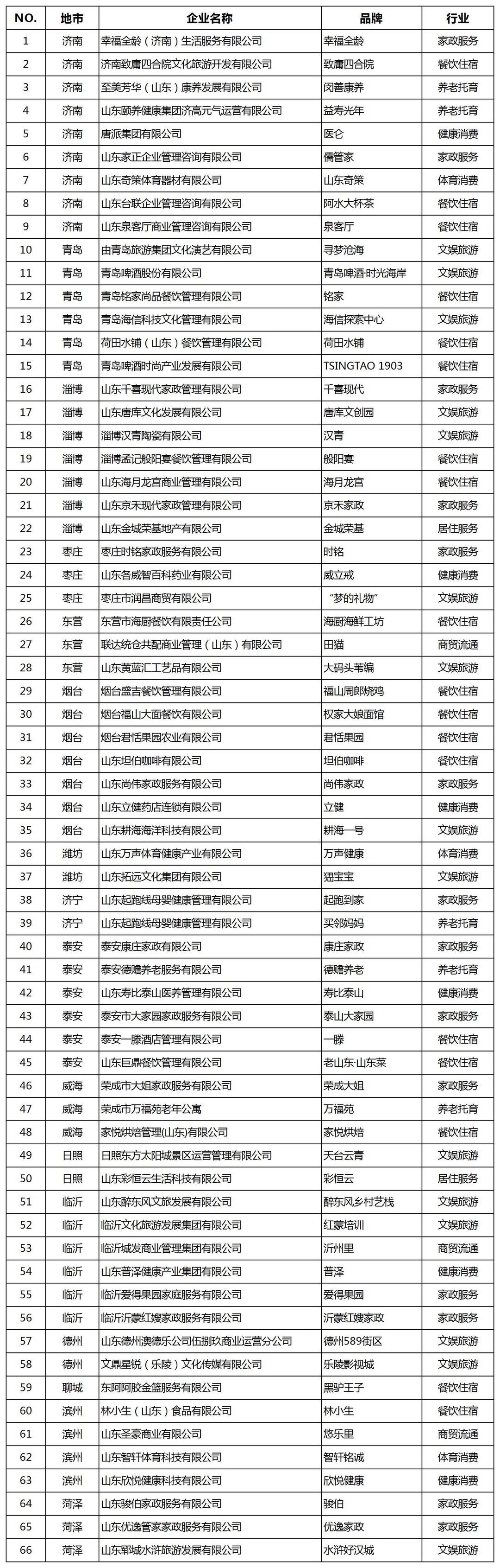 其中,淄博共有7家企业入围,分别是山东千喜现代家政管理有限公司、山东唐库文化发展有限公司、淄博汉青陶瓷有限公司、淄博孟记般阳宴餐饮管理 有限公司、山东海月龙宫商业管理有限公司、山东京禾现代家政管理有限公司以及山东金城荣基地产有限公司。 据介绍,本次发布的新品牌呈现出"覆盖广、认可度高、创新强"三大鲜明特点。从行业分布来看,涵盖餐饮住宿、文娱旅游、家政服务、养老托育、体育 消费等多个重点领域,成为山东服务消费高质量发展的生动缩影。这些品牌既传承齐鲁文化基因,又精准契合现代消费需求,将为消费者带来更优质、多 元、便捷的服务体验。 | NO. | 地市 | 企业名称 | 品牌 | 行业 | | --- | --- | --- | --- | --- | | 1 | 济南 | 幸福全龄(济南)生活服务有限公司 | 辛福全龄 | 家政服务 | | 2 | 济南 | 济南致庸四合院文化旅游开发有限公司 | 致庸四合院 | 餐饮住宿 | | 3 | 济南 | 至美芳华(山东)康养发展有限公司 | 闵雪泉乔 | 乔老托育 | | 4 | 汾南 | 山东颐养健康集团医养(集团)有限公司 | 益寿光年 | 养老托育 | | 5 ...
