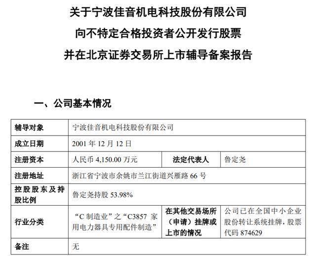 公司基本情况与上市进程 - 公司全称为宁波佳音机电科技股份有限公司,成立于2001年12月12日,注册资本为人民币4150.00万元 [1] - 公司专业从事研发、制造及销售各泵、阀以及传感器等流体控制系统核心零部件,产品可广泛应用于智能家电、汽车、医疗、新能源等行业 [1] - 公司已于2025年1月22日在宁波监管局启动北交所IPO辅导,辅导机构为广发证券 [1] - 公司此前已在全国中小企业股份转让系统挂牌,股票代码为874629 [1] 股权结构与实际控制人 - 公司控股股东及实际控制人为鲁定尧与陈芝波,二人为夫妻关系 [3] - 鲁定尧直接持有公司53.98%的股份,陈芝波直接及通过两家企业间接合计控制公司31.02%的股份,二人合计控制公司87.03%的表决权 [3] - 2025年10月30日,原一致行动人阮智芸退出,其股份将全部转出 [3] - 同日,高炎康成为新的受让方并与鲁定尧、陈芝波签署新的《一致行动人协议》 [3] - 高炎康现年72岁,为上市公司朗迪集团(SH:603726)的董事长,持有朗迪集团52.52%的股份 [3][4] 财务表现与盈利能力 - 2024年,公司实现营业收入8.08亿元,较上年同期的5.34亿元大幅增长51.16% [2] - 2024年,公司归属于挂牌公司股东的净利润为6093.78万元,同比增长23.64% [2] - 2024年,公司归属于挂牌公司股东的扣除非经常性损益后的净利润为6073.86万元,同比增长35.98% [2] - 2024年,公司毛利率为20.62%,较上年同期的22.01%有所下降 [2] - 2025年1-6月,公司实现营业收入4.87亿元,同比增长46.93% [3] - 2025年1-6月,公司归属于挂牌公司股东的净利润为2952.63万元,同比下降9.23% [3]