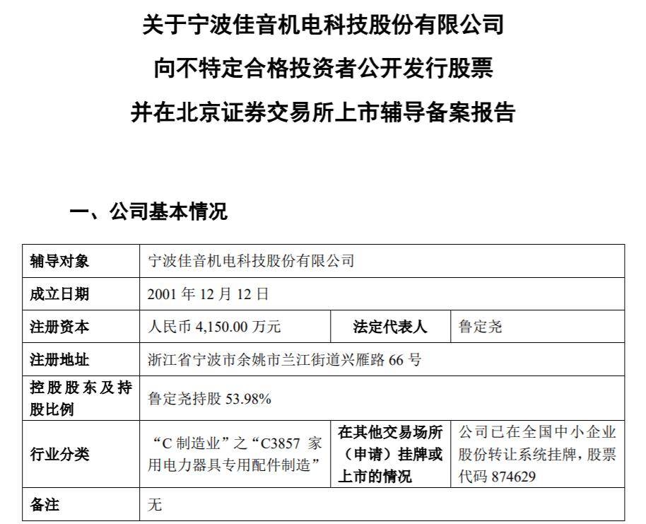 公司基本情况与上市进程 - 公司全称为宁波佳音机电科技股份有限公司,成立于2001年12月12日,注册资本为人民币4150万元,注册地址位于浙江省宁波市余姚市 [1] - 公司已在全国中小企业股份转让系统挂牌,股票代码为874629,并于2025年1月21日在宁波监管局启动北交所IPO辅导,辅导机构为广发证券 [1] - 公司实际控制人为鲁定尧和陈芝波,二人为夫妻关系,合计控制公司87.03%的表决权 [4] - 鲁定尧直接持有公司53.98%的股份,担任公司董事长、总经理 [1][4] - 陈芝波直接及通过两家企业间接合计控制公司31.02%的股份,担任公司总经理助理 [4] 行业与主营业务 - 公司行业分类为“C制造业”之“C3857 家用电力器具专用配件制造” [1] - 公司专业从事研发、制造及销售各泵、阀以及传感器等流体控制系统核心零部件 [1] - 公司产品可广泛应用于智能家电、汽车、医疗、新能源等行业 [1] 客户与市场地位 - 公司已进入飞利浦、TTI、SEB、石头科技、莱克电气、美的集团、新宝股份、追觅科技等知名企业供应链体系 [2] - 公司已逐步发展成为一家在生产规模、产品种类、研发实力、产品质量领域均具备较强竞争力的企业 [2] 财务表现 - 2024年,公司营业收入为8.08亿元,较上年同期的5.34亿元增长51.16% [3][4] - 2024年,公司归属于挂牌公司股东的净利润为6093.78万元,较上年同期的4928.49万元增长23.64% [3][4] - 2024年,公司扣除非经常性损益后的净利润为6073.86万元,较上年同期的4466.87万元增长35.98% [3] - 2024年,公司毛利率为20.62%,上年同期为22.01% [3] - 2024年,公司基本每股收益为1.47元,较上年的1.19元增长23.53% [3] - 2025年1-6月,公司营业收入为4.87亿元,同比增长46.93% [4] - 2025年1-6月,公司归属于挂牌公司股东的净利润为2952.63万元,同比下降9.23% [4] 管理层背景 - 董事长兼总经理鲁定尧,1972年12月出生,拥有工商管理硕士学位,自公司成立起任职,拥有丰富的行业技术与管理经验 [4] - 总经理助理陈芝波,1973年出生,拥有中专学历,自公司成立起任职,拥有长期的行业从业经验 [5]
