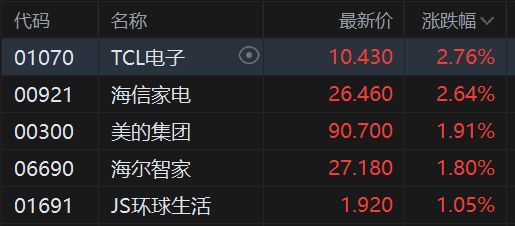 港股异动丨家电股普涨 TCL电子涨近3% 美的集团创阶段新高