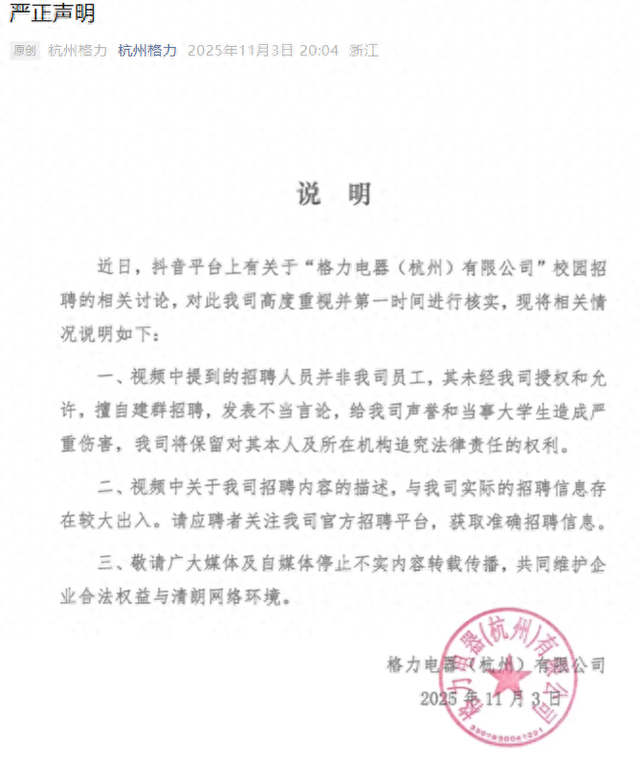 2025.11. 04 本文字数:395,阅读时长大约1分钟 格力电器(杭州)有限公司 11月3日晚间发布 严正声明 。 近日,抖音平台上有关于"格力电器(杭州)有限公司"校园招聘的相关讨论,对此我司高度重视并 第一时间进行核实,现将相关情况说明如下: 一、视频中提到的招聘人员并非我司员工,其未经我司授权和允许,擅自建群招聘,发表不当言论, 给我司声誉和当事大学生造成严重伤害,我司将保留对其本人及所在机构追究法律责任的权利。 微信编辑 | 七三 二、视频中关于我司招聘内容的描述,与我司实际的招聘信息存在较大出入。请应聘者关注我司官方 招聘平台,获取准确招聘信息。 三、敬请广大媒体及自媒体停止不实内容转载传播,共同维护企业合法权益与清朗网络环境。 第 一 财 经 持 续 追 踪 财 经 热 点 。 若 您 掌 握 公 司 动 态 、 行 业 趋 势 、 金 融 事 件 等 有 价 值 的 线 索 , 欢 迎 提 供 。 专 用 邮 箱 : bianjibu@yicai.com (注:我们会对线索进行核实。您的隐私将严格保密。) 推荐阅读 600200,多重退市警报拉响 ...