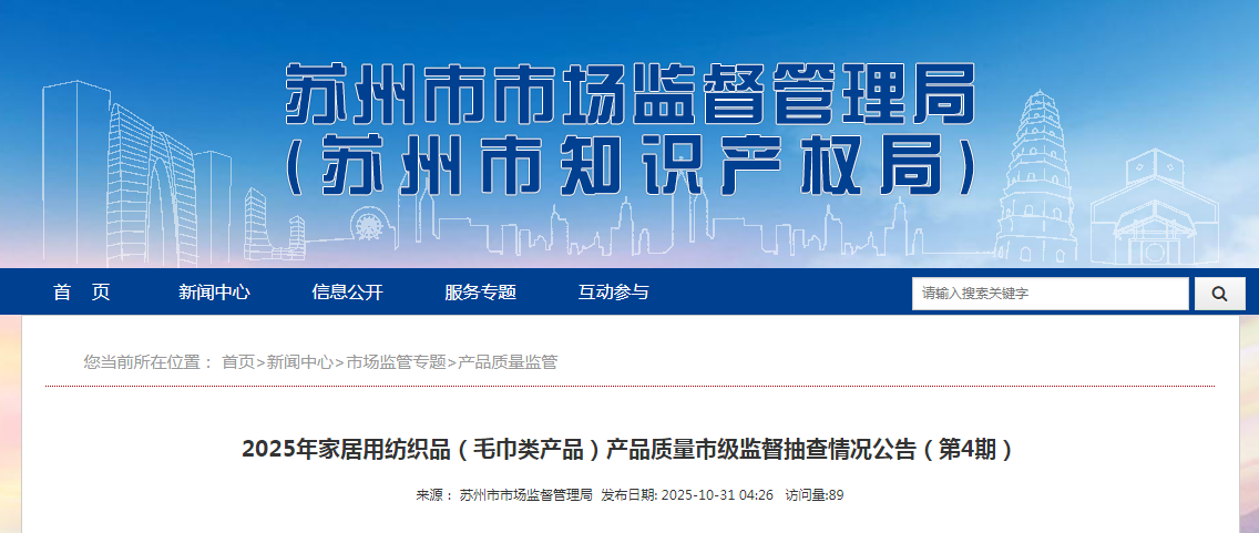 江苏省苏州市市场监督管理局发布2025年家居用纺织品(毛巾类产品)产品质量市级监督抽查情况(第4期)
