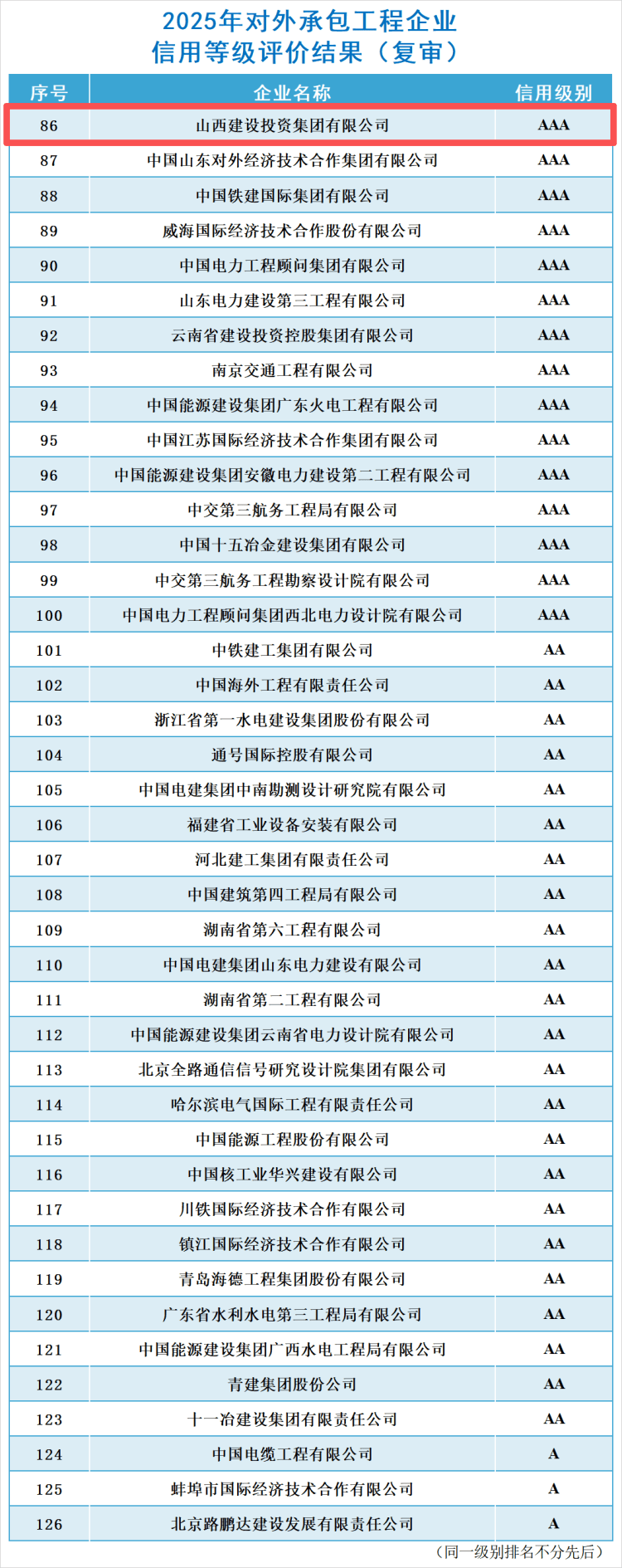 公司信用等级评价结果 - 2025年11月13日,山西建设投资集团有限公司通过对外承包工程AAA级信用企业复审,连续八年被评为最高信用等级AAA级企业[1] - 2025年对外承包工程企业信用等级评价结果显示,共有包括山西建投在内的24家企业获得AAA评级,19家企业获得AA评级,2家企业获得A评级[3][4] 公司业务与战略布局 - 公司作为山西省属国企"走出去"的先锋队和主力军,构建了以国际工程承包为主体、国际投资和国际贸易为两翼的"一体两翼"格局[1] - 公司业务聚焦非洲、东南亚、中亚、中东等重点区域市场,业务足迹遍及67个国家和地区[1] - 公司在基础设施建设、石油化工、设计咨询等领域建设实施了一批有国际影响力的精品工程[1] 行业评价体系 - 中国对外承包商会企业信用等级评价由国家有关部委指导,由承包商会统一组织,采用会员企业自主申报、社会信用评级机构专业评定的模式[2] - 评审委员会由政府部门、金融机构、信用评级机构、学术机构、会员企业等具有丰富行业管理经验的人员组成[2] 公司未来发展 - 公司将持续深耕国际工程承包市场,继续做强做优主体业务[1] - 公司计划进一步提升对外承包工程领域的行业竞争力、业务拓展力和品牌影响力,构建国际竞争新优势[1]