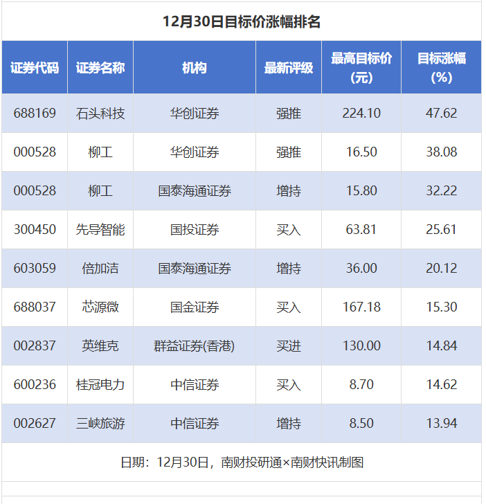 从券商推荐家数来看,12月30日有29家上市公司得到券商推荐,其中桂冠电力、柳工均获得2家推荐,皖维高新等 获得1家推荐。 | | 12月30日券商推荐家数排名 | | | | --- | --- | --- | --- | | 证券代码 证券名称 | 收盘价(元) | 评级券商数量 | 行业 | | 600236 桂冠电力 | 7.59 | 2 | 电力 | | 000528 柳工 | 11.95 | 2 | 工程机械 | | | 日期:12月30日,南财投研通×南财快讯制图 | | | 评级调低方面,12月30日,券商调低上市公司评级达到1家,中信证券对三峡旅游的评级从"买入"调低至"增持"。 南财投研通数据显示,12月30日,券商给予上市公司目标价共9次,按最新收盘价计算,目标价涨幅排名居前的公 司有石头科技、柳工,目标价涨幅分别为47.62%、38.08%,分别属于小家电、工程机械行业。 | | | 12月30日目标价涨幅排名 | | | | | --- | --- | --- | --- | --- | --- | | 证券代码 | 证券名称 | 机构 | 最新评级 | 最高目标价 (元) | 目标 ...