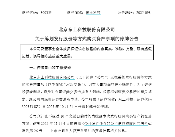 10月20日晚间,东土科技(300353)公告称,公司正在筹划发行股份等方式购买资产事项(以下简称"本次交易")。因有关 事项尚存在不确定性,经公司向深交所申请,公司股票自2025年10月21日开市时起开始停牌。 | 注册地址 | 北京市海淀区知春路 63号 51 号楼 11 层 1102-1105 室 | | --- | --- | | 主要办公地址 | 北京市海淀区知春路 63 号 51 号楼 11 层 1102-1105 室 | | 法定代表人 | 张涓 | | 注册资本 | 10,340 万人民币 | | 企业类型 | 股份有限公司(非上市、自然人投资或控股) | | 成立日期 | 2001 年2月 21 日 | | 经营范围 | 技术开发、技术咨询、技术服务、技术培训:销售工业自动控制系 | | | 统、自动化成套控制装置系统、集中控制装置、智能控制装置、控 | | | 制(调节)仪表系统、显示仪器、基地式仪表、执行器、气动单元 | | | 组合仪表、电动单元组合仪表、电工仪器仪表、楼宇控制系统、自 | | | 行开发后的产品、机械设备、电子产品、通讯设备、五金、交电; | | | 应用软件服务:基 ...