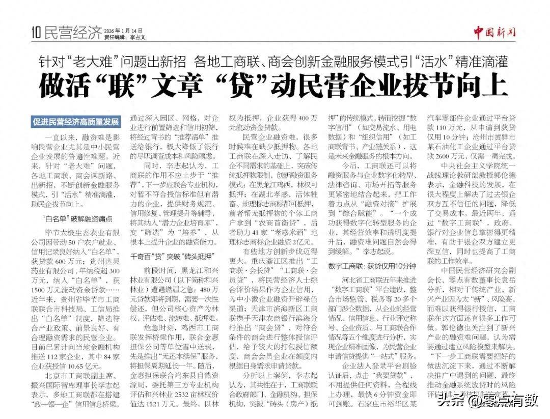 文章核心观点 - 各地工商联及商会通过创新金融服务模式,如建立“白名单”制度、挖掘新型抵押物、利用数字技术等,有效缓解民营企业特别是中小企业的融资难题,并推动服务从“融资对接”向“综合赋能”升级 [4][5][6][7] 针对融资难问题的创新实践 - 贵州省毕节市工商联联合政府部门推出“白名单”制度,筛选符合产业政策、前景良好的企业向金融机构推送,已累计推送112家企业,其中84家获得授信10.65亿元 [4] - 北京市工商联副主席指出,多地工商联通过搭建“政—银—企”信用信息桥梁,对企业进行前置筛选和信用初筛,形成“推荐清单”推送给银行,降低了银行的尽调成本和风险顾虑 [4] - 工商联的下一步作用应超越“推荐”,联合专业机构对暂不符合标准但有潜力的企业提供财务规范、信用修复等辅导,将其纳入“潜力企业培育库”,变“筛选”为“培养” [4] 抵押物与担保模式创新 - 针对民营企业缺少传统抵押物的问题,各地工商联创新融资服务模式,例如黑龙江鸡西市以林权为抵押,帮助和兴林业评估2532亩林权价值达1521万元,最终获得400万元贷款 [5] - 湖北孝感市突破传统限制,允许以活体牲畜、地理标志商标作为抵押物,前者帮助个体工商户获得贷款,后者助力41家“孝感米酒”地理标志商标企业融资2亿元 [5] - 重庆綦江区推出“工商联·会长贷”等产品,将民营经济人士综合评价结果作为企业信用;天津市滨海新区工商联推出“商会贷”,对符合条件的商会进行整体授信评估,给予打包授信额度 [6] 数字化与综合赋能服务 - 河北省工商联推进“数字工商联”平台建设,整合20多个部门涉企数据,从五个维度进行企业精准画像,为民营企业提供信贷“一站式”服务 [7] - 企业通过“数字工商联”平台刷脸认证后,可全程线上办理贷款,最快6分钟资金到账,案例显示有企业10分钟获贷110万元,有企业一周内完成2600万元贷款 [7] - 金融科技的发展解决了银企互信问题,降低了交易成本,“数字工商联”使政府和银行对企业信息掌握更精准,有助于建立更深互信并提高工商联工作效率 [7] - 未来工商联可将融资服务与企业数字化转型、法律咨询、市场开拓等服务更紧密结合,工作着力点从“融资对接”扩展到“综合赋能” [7] 对新兴产业的关注与未来方向 - 相对于传统产业,新兴产业因风险高而难以获得银行授信,工商联在这方面还有很多工作可做 [8] - 需要通过建立风险模型来解决新兴产业融资难问题,工商联需将好的做法沉淀下来,通过解决推广中的问题,最终推动金融系统风险评估与考核机制的变革 [8]