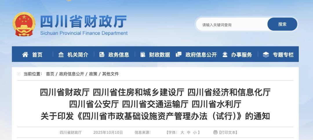 扫码文末"投小圈" 加入行业交流群 文章来源:四川省财政厅 四川省财政厅 四川省住房和城乡建设厅 四川省经济和信息化厅 四川省公安厅 四川省交通运输厅 四川省水利厅 关于印发《四川省市政基础设施资产管理办法(试行)》的通知 川财资〔2025〕78号 各市(州)及扩权县财政、住房城乡建设、经济和信息化、公安、交通运输、水利行政主管部门: 为规范和加强我省市政基础设施资产管理,更好发挥市政基础设施公共服务功能,健全完善国有资产报告制度,根据《市政基础设施资产管理办法(试 行)》(财资〔2024〕108号)等规定,我们研究制定了《四川省市政基础设施资产管理办法(试行)》。现予印发,请遵照执行。 四川省财政厅 四川省住房和城乡建设厅 四川省经济和信息化厅 四川省公安厅 四川省交通运输厅 四川省水利厅 2025年9月22日 四川省市政基础设施资产管理办法(试行) 第一章 总 则 第一条 为规范和加强市政基础设施资产管理,更好发挥市政基础设施资产公共服务功能,根据《行政事业性国有资产管理条例》(国务院令第738号) 《市政基础设施资产管理办法(试行)》(财资〔2024〕108号),以及《中共四川省委关于建立省政府向省人大 ...