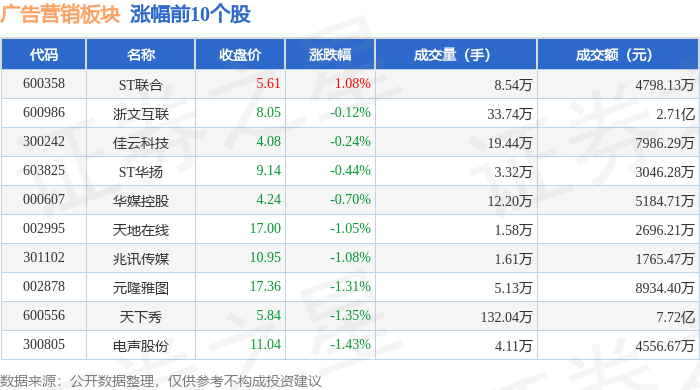 证券之星消息,10月16日广告营销板块较上一交易日下跌2.32%,分众传媒领跌。当日上证指数报收于 3916.23,上涨0.1%。深证成指报收于13086.41,下跌0.25%。广告营销板块个股涨跌见下表: | 代码 | 名称 | 收盘价 | 涨跌幅 | 成交量(手) | 成交额(元) | | --- | --- | --- | --- | --- | --- | | 600358 | ST联合 | 5.61 | 1.08% | 8.54万 | 4798.13万 | | 600986 | 浙文互联 | 8.05 | -0.12% | 33.74万 | 2.71亿 | | 300242 | 佳云科技 | 4.08 | -0.24% | 19.44万 | 7986.29万 | | 603825 | ST华扬 | 9.14 | -0.44% | - 3.32万 | 3046.28万 | | 000607 | 华媒控股 | 4.24 | -0.70% | 12.20万 | 5184.71万 | | 002995 | 天地在线 | 17.00 | -1.05% | 1.58万 | 2696.21万 | | 301102 ...