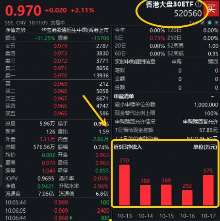 10月20日,截至10时10分,全市场首只香港大盘30ETF(520560)盘中表现稳健,场内价格劲升2%, 基金最新规模为6.81亿元。成份股方面,阿里巴巴-W、中芯国际、中通快递-W均涨超4%。 资金面,香港大盘30ETF(520560)自10月13日上市以来5个交易日,实现日日资金净流入,近5日累计 获净增持2400万元! | | 0.970 +0.020 +2.11% | | | 香港大盘30ETF 0> | | | | --- | --- | --- | --- | --- | --- | --- | | | | | | 520560 | | | | SSE CNY 10:11:05 交易中 | | | | | | THE / 0 + | | 净值走势 | 牛士理》画中中国画像光世界 | | 交年 | 0.00% 120日 | | 0.00% | | 委比 | -31.25% 委章 | -15706 | 5日 | 0.73% 250日 | | 0.00% | | 苑 | 0.974 | 2787 | SOH | 0.00% 52周高 | | 1.00 | | 2000 | 0.973 | 3830 ...