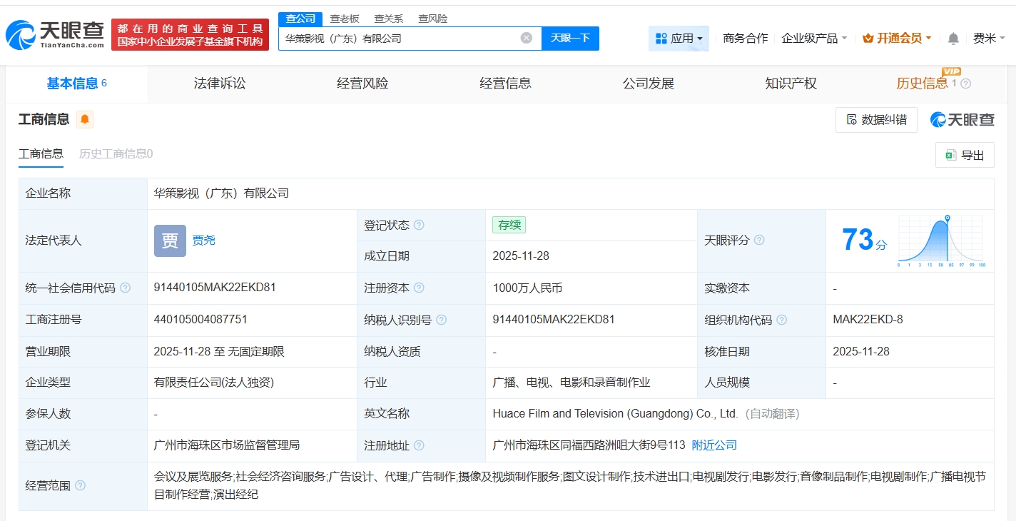 公司新设子公司 - 华策影视(300133)新近成立全资子公司华策影视(广东)有限公司 [1] - 新公司法定代表人为贾尧,注册资本为1000万人民币 [1] - 新公司由华策影视全资持股 [1] 新公司基本信息 - 公司成立于2025年11月28日,登记状态为存续 [2] - 企业类型为有限责任公司(法人独资),所属行业为广播、电视、电影和录音制作业 [2] - 注册地址位于广州市海珠区 [2] 新公司经营范围 - 核心业务范围包括会议及展览服务、社会经济咨询服务、电视剧发行、电影发行等 [2] - 经营范围还涵盖广告设计、代理与制作,摄像及视频制作服务,以及技术进出口 [2] - 业务范围包括演出经纪 [2]
