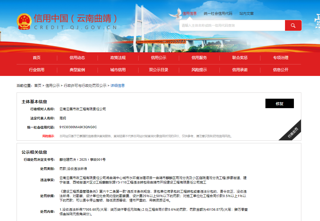 近日,曲靖市麒麟区住房和城乡建设局对云南云展市政工程有限责任公司发出行政处罚决定书(麒住建罚决﹝2025﹞事故001号),因该公司在曲靖中心 城市水环境治理项目中存在违法转包行为,被处以没收违法所得及罚款的行政处罚。 据处罚信息显示,云南云展市政工程有限责任公司在承建曲靖中心城市水环境治理项目——麒麟区雨污分流及小区庭院清污分流工程(寥廓街道、建宁 街道、西城街道片区)2工段麒麟东路Y3-Y10工程期间,将工程违法转包给曲靖市开投建设工程有限责任公司施工。 麒麟区住房和城乡建设局依据《建设工程质量管理条例》第六十二条第一款规定,对云展公司作出如下处罚:一是没收违法所得77005.60元(柒万柒仟零 伍元陆角);二是处工程合同价款0.6%的罚款,金额为40136.87元(肆万零壹佰叁拾陆元捌角柒分)。处罚决定日期为2025年10月14日。 | 主体基本信息 | | 修复 | | --- | --- | --- | | 行政相对人名称: 云南云展市政工程有限责任公司 | | | | 法定代表人名称: 周纲 | | | | 统一社会信用代码: 91530300MA6K3QNG0C | | | | 风险带示。 | 本 ...