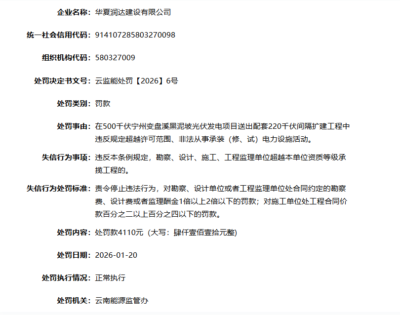 公司违规处罚事件 - 华夏润达建设有限公司因在500千伏宁州变盘溪黑泥坡光伏发电项目送出配套220千伏间隔扩建工程中违反规定,超越许可范围、非法从事承装(修、试)电力设施活动,被云南能源监管办处以4110元罚款 [1] - 公司成立于2011年,位于河南省新乡市,是一家以从事建筑装饰、装修和其他建筑业为主的企业 [1] - 公司注册资本为15180万人民币 [1]