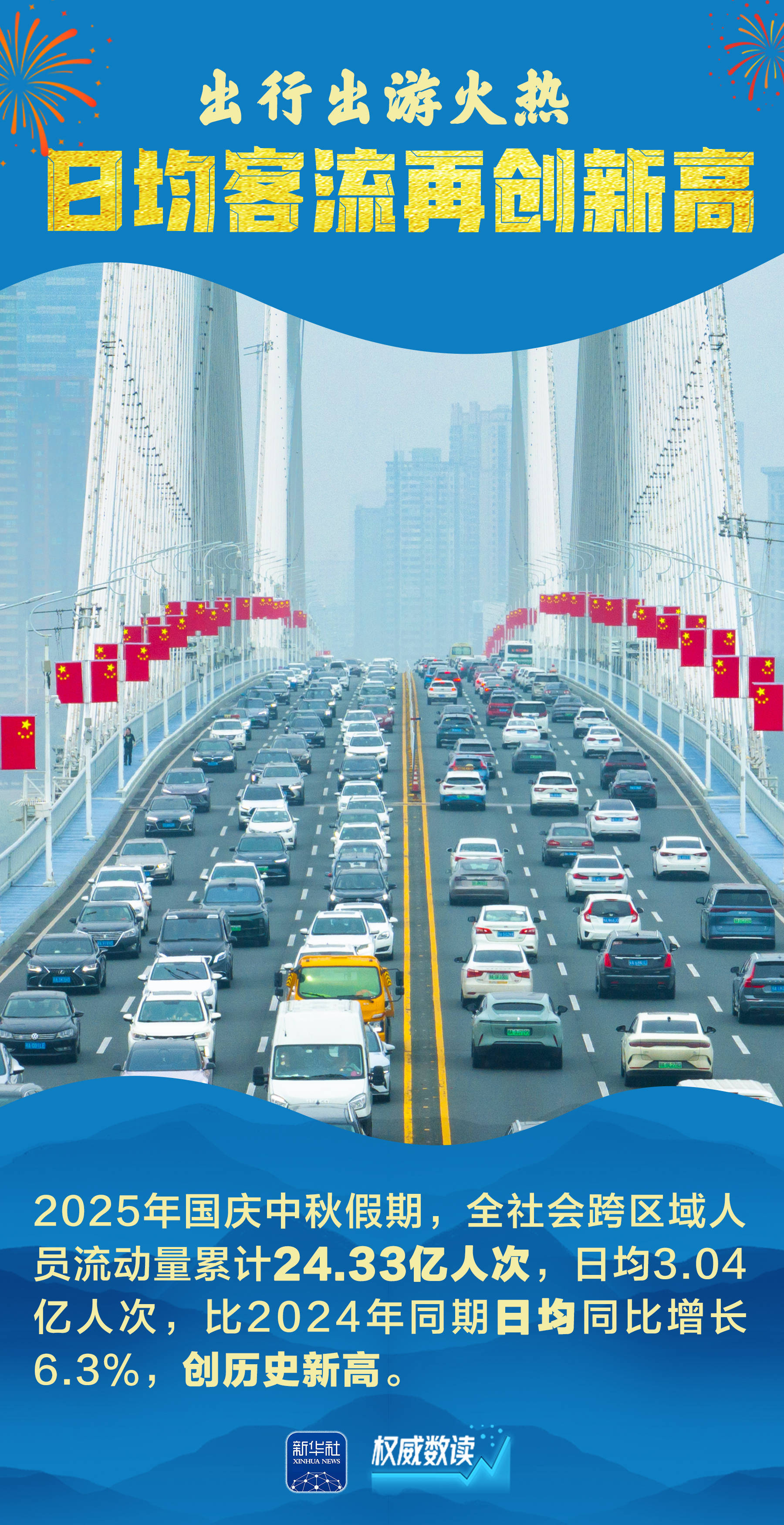今年国庆中秋假期,全国 陪4627 2 官人 疯出外人 作TUDHOWATZI7 204.3万人次,较去年同扩 单日出入境通关最高峰出 达235.3万人次。 新华社 氣裤市场热 到本书记 2025年国庆叠加中秋、家国同庆,交通出行、文化旅游、消费市场等都呈现火热场景。每一组跃动的数据,展示经济的奔腾活力;每一个热闹的场景,彰显 发展的蓬勃生机。让我们跟随海报,一起感受这个火热奔腾、祥和喜庆的国庆中秋长假。 2025年国庆中秋假期, 员流动量累计24,33亿人 亿人次,比2024年同期 00/ All Phone 刷力足利后。 0.5%; 权威数读 部门手机 XINHUA NEWS 行业 k 11,8 权威数读 t the lar well Hards the state 0.0 ST 3200 3 3 3 7 8 假日8天,全国国内出游8 2024年国庆节假日7天增7 国内出游总花费8090.06 年国庆节假日7天增加108 新华社 权威数读 氣旅市场热 n Frant Real l n 9288 s 6. 15 S ing 118 . 44 n CONTRICTOR PARTY STERNERS FOR 家 ...